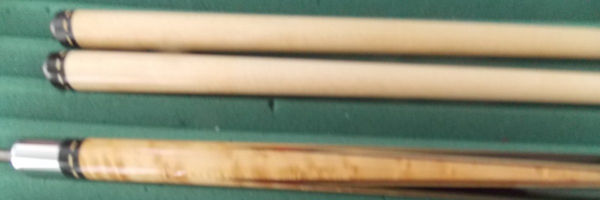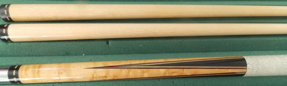 maple, green, red, black veneers. white/ green speck linen. butt 15.6oz, shafts micarta ferrules [hard to find, straight] 3.6-3.8oz= 19.2-.04oz, 12.8-12.65mm