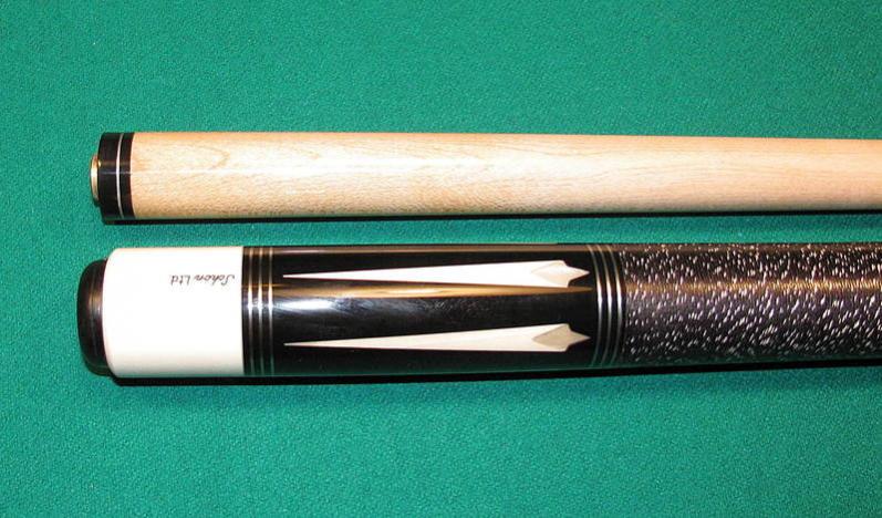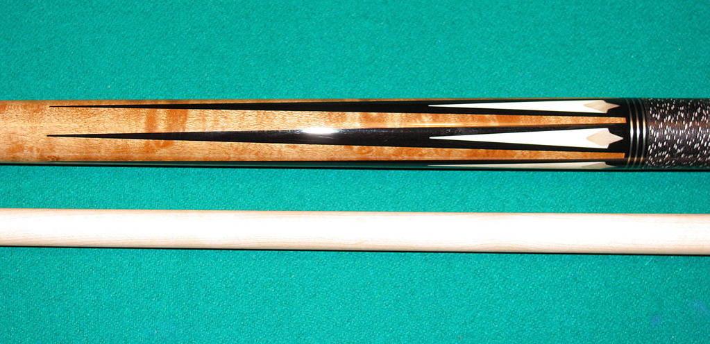Schon custom pool cue with Birdseye Maple forearm, Gaboon Ebony points with large spears with Abalone inlays in each point. The butt is Gaboon Ebony with reverse spears with more Abalone inlays. There are three sets of Balabushka style rings. The wrap is Irish Linen (Black with White Spec), the joint is 5/16 x 14 stainless steel. This cue comes with one 13 mm shaft w/ pro taper.