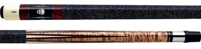 Strike fear in the heart of your competition with the deadly Schon CX51 custom cue. Four Ivory skull shaped inlays are meticulously set in Ebony on the sleeve of this cue, which is flanked by large sections of magnificent Cocobolo wood. Cocobolo, Ivory and Ebony points continue on the forearm on top of Natural-stained Birdseye Maple. A white spec Irish linen wrap, designed for a sure grip, connects the two sections. This cue provides a lethal hit with its piloted stainless steel joint and shorter shaft taper. From its tip to the bumper, this pool stick embodies the tradition of excellence you expect from a Schon.
