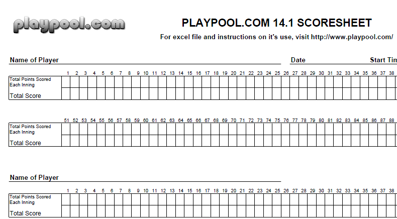 Jim gets up and runs 2 full racks and after each rack we write +14 to show that 14 balls were added to the table again. As you can see we have +14 twice, that shows that Jim ran 2 racks then there is an X to show that he missed the break ball and his run stopped there. Put 28 in his top box and add that to the bottom of the previous frame for a total of 38.