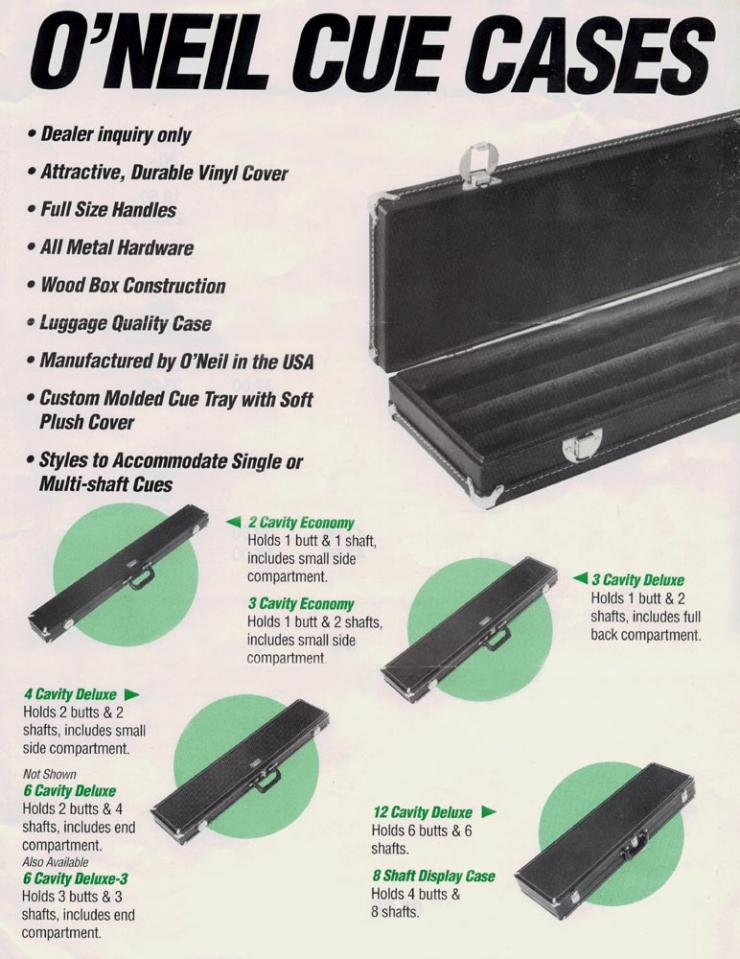 TATE AzB Gold Mensch Silver Member Sep 30, 2012 #3 The top case is an O'Neil (see flyer below). The bottom case looks like it might be a Palmer from the 1980's, although I'm not 100% sure. Nice cues by the way! Attachments oneil_cases.jpg 91.6 KB · Views: 146