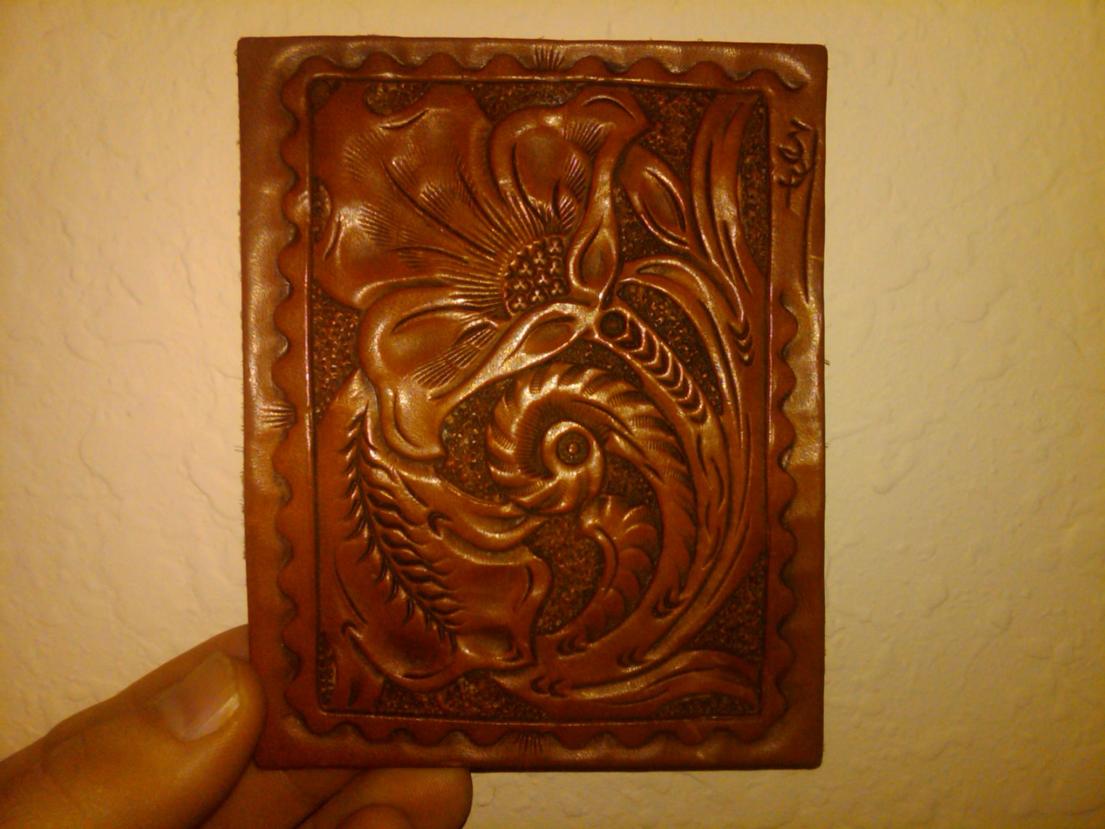 i am not doing these but an expert leatherworker that i know is offering his services. if you can draw it he can put it in leather. here is an example of his work...you can have this for 30 shipped....if anyone is interesed in another send me an image and ill have him quote you a price, he can do anything literally. if you order more than one he will cut you a break also. i cant do these because you guys know i still have a few more cases to finish up :smile: