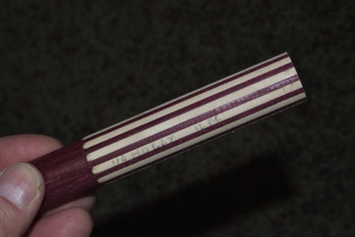 This billet is made with a PurpleHeart base wood and the 12 slots are filled with 1/8 inch wide Holly inlay strips. The inlay length is 3.5 inch with the overall length of 4.75 inch The diameter is 0.854 so only useable if you use a joint size that can handle that ring diameter. I would guess that an 0.850 joint at max. The inlays are deep enough to allow use on a joint at least 0.800, maybe a bit smaller? So most cue-makers will find this billet fine for their use on a shaft collar I think. I make my billets longer to allow grabbing the base with a chuck when one is close to the last of the ring material, less waste this way.