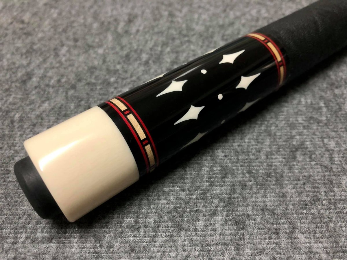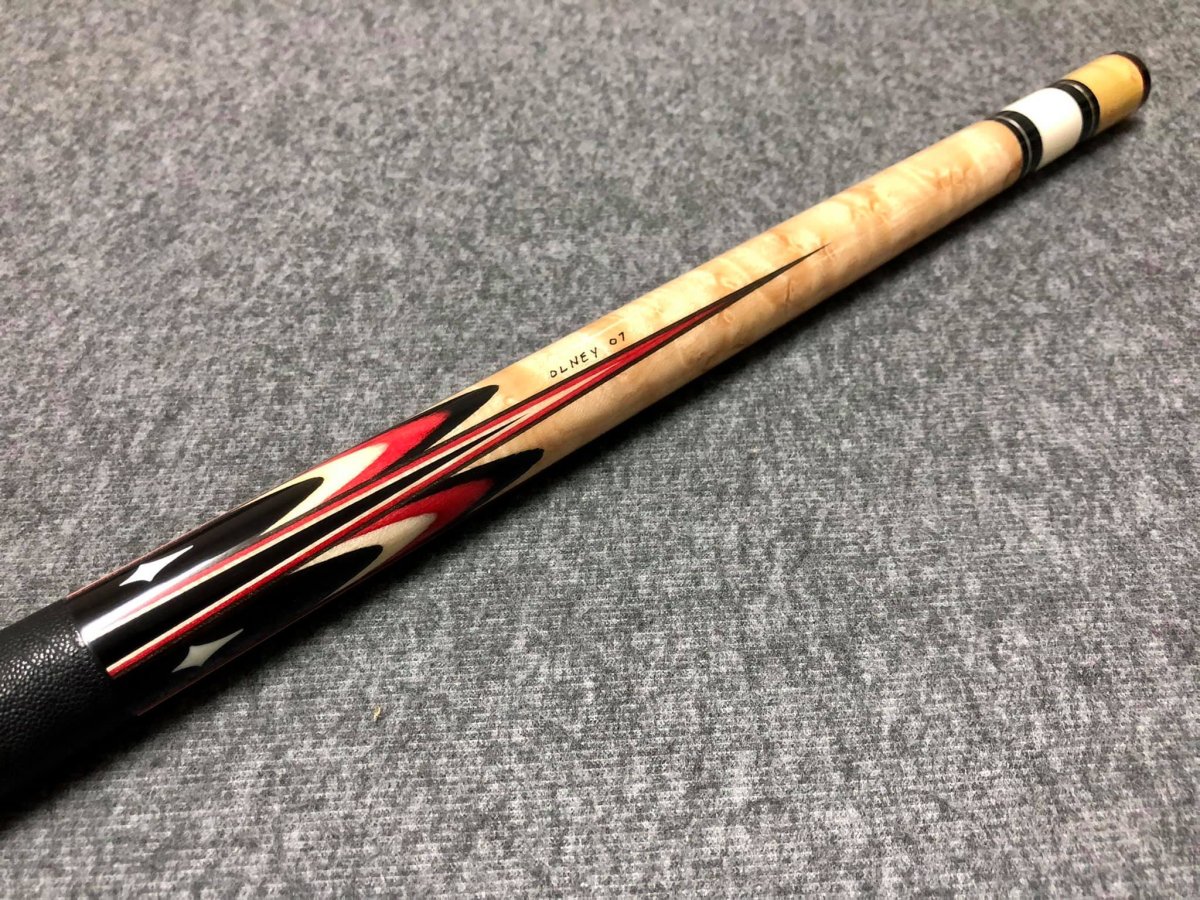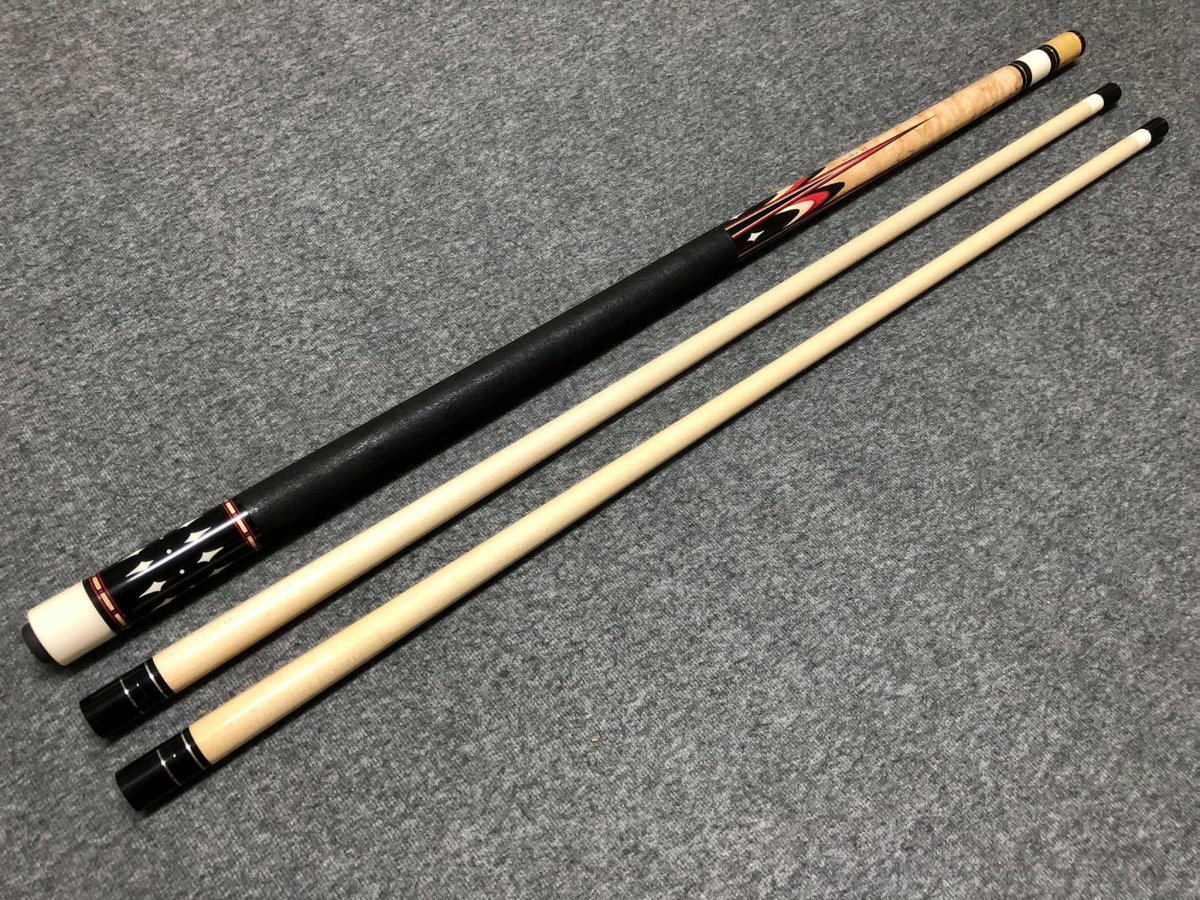 I just picked up my first Starkey. The end of the middle splice is both the actual balance point and the visual balance point on this cue. I was unsure if I'd like the contrasting point woods, but I am appreciating it more now that I have it in person. The asymmetry makes it distinct, but still balanced. It's a no frills cue. I'm sure the diagonal splicing contributes to the stiffness. It's kind of a split personality cue. One side is loud BEM, the other is a muted yellow heart or Osage possibly. The shafts are very different as well. One is ferrule-less with a larger tip I'll be using for 1P and 14.1, and it has a nice light tone. But the other is a flat laminate shaft with antler ferrule and a smaller diameter tip. This is a perfect 9 ball shaft. The spine taper is thinner on the laminate than the standard shaft, but the wood is more dense so it doesn't seem to adversely affect stiffness.