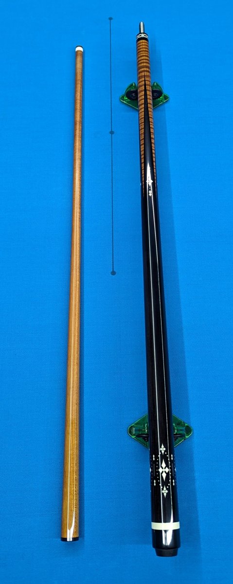 Beautiful Shelby Williams cue. Roasted curly maple (kielwood) into ebony splice loaded with silver dots, silver lines, holly and slotted cross inlays. Custom ring at joint and setup so if you use a different shaft it still looks great with the ring location. Bottom has solid white ring with Shelby signature. Cue rolls straight together and apart and plays fantastic. It does have one noticeable ding that must have rolled on the hard surface as it wraps around the butt near one of the top of the points but is not through the clear. If I don't get any serious offers I plan to have that repaired and then listed for a slightly higher amount.