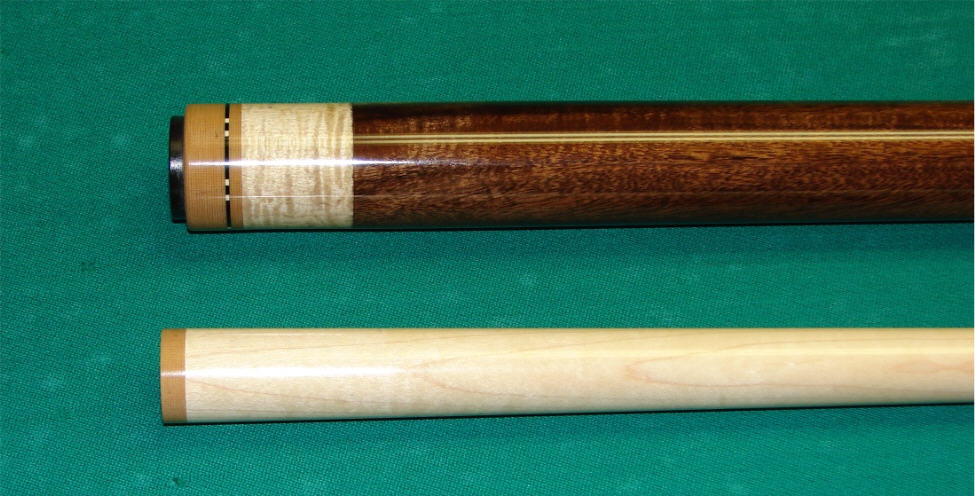 The cue features a curly maple SW style deco ring with Micarta ringwork in the butt. Natural linen collars & buttcap. This cue also has a custom bumper made of phen sleeved with ABS and it accepts an ultralight 18" extension. The 12.3/4mm shaft is a nice 4.3oz & the cue weighs 19.3oz total. The ferrule is Tigers Saber-T & the tip is a Kamui M. I simply can't make a cue play better than this one. Another unique feature...the cue has no metal in it.
