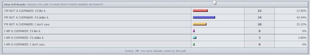 This poll is about whether you would like to see pivot points marked on shafts. Please vote in the correct category. Choose from the first three if you are not a cuemaker; choose from the last three if you are a cuemaker.