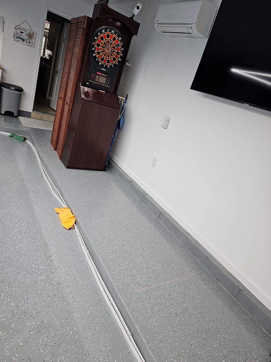 Pro Tip #1: Make friends with the Framing Crew Lead and share the spec diagrams on the table and light that Diamond provided to you. Get your cue out and guesstimate where the table needs to be to ensure adequate stroke room all around. Then, have them set chalk lines. Finally, have them make a distinct symbol (cross) exactly at the point the electrical outlet will go in the ceiling. Finally, take a picture, add a note and give it to the electrical crew.
