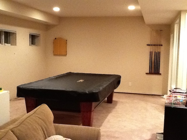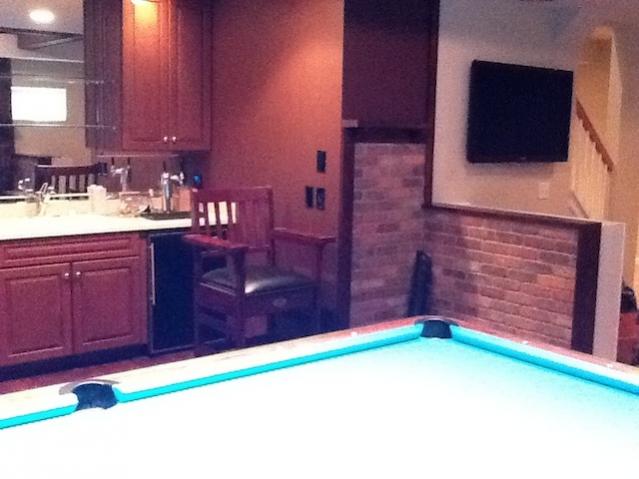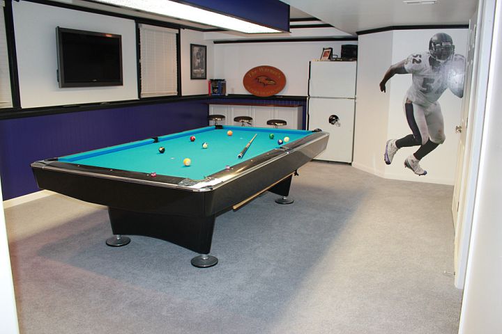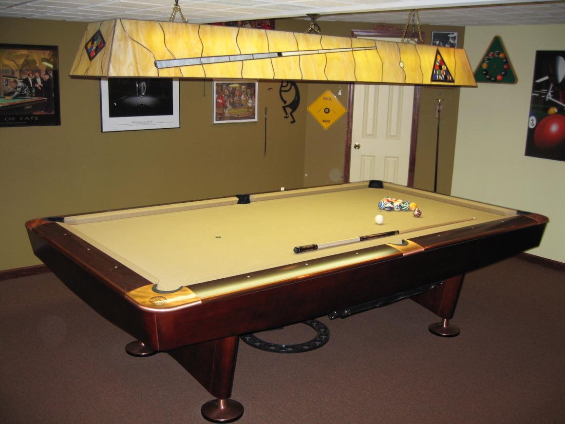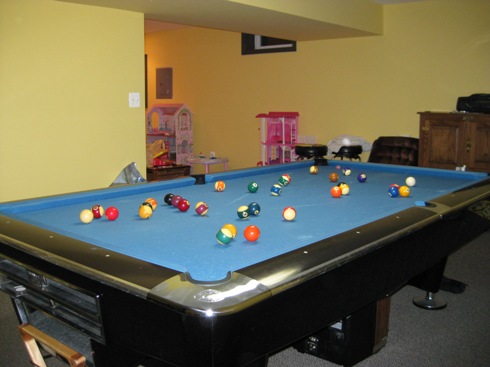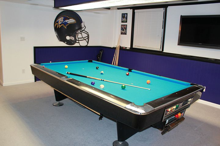John (Scruffy 1) of Classic Billiards Service set my table up a few months ago with blue simonis and diamond 3/16 shims but I am finally am getting around to finishing up the basement. My basement was totally unfinished when I started. It was nothing but a concrete floor, insulated walls and a support pole right where the side pocket is now located. Here area few photos now that everything is 90 percent done.