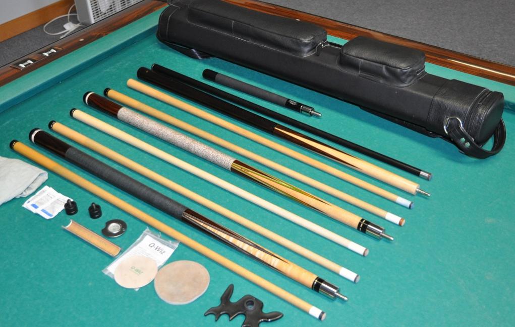 The lower left cue (John Showman 2000) is my daily player. The middle cue (Lee Peppers 2012) is for league nights. The shafts from bottom to top are Showman (x2), Schick, and Barry Szamboti.