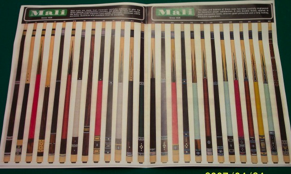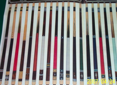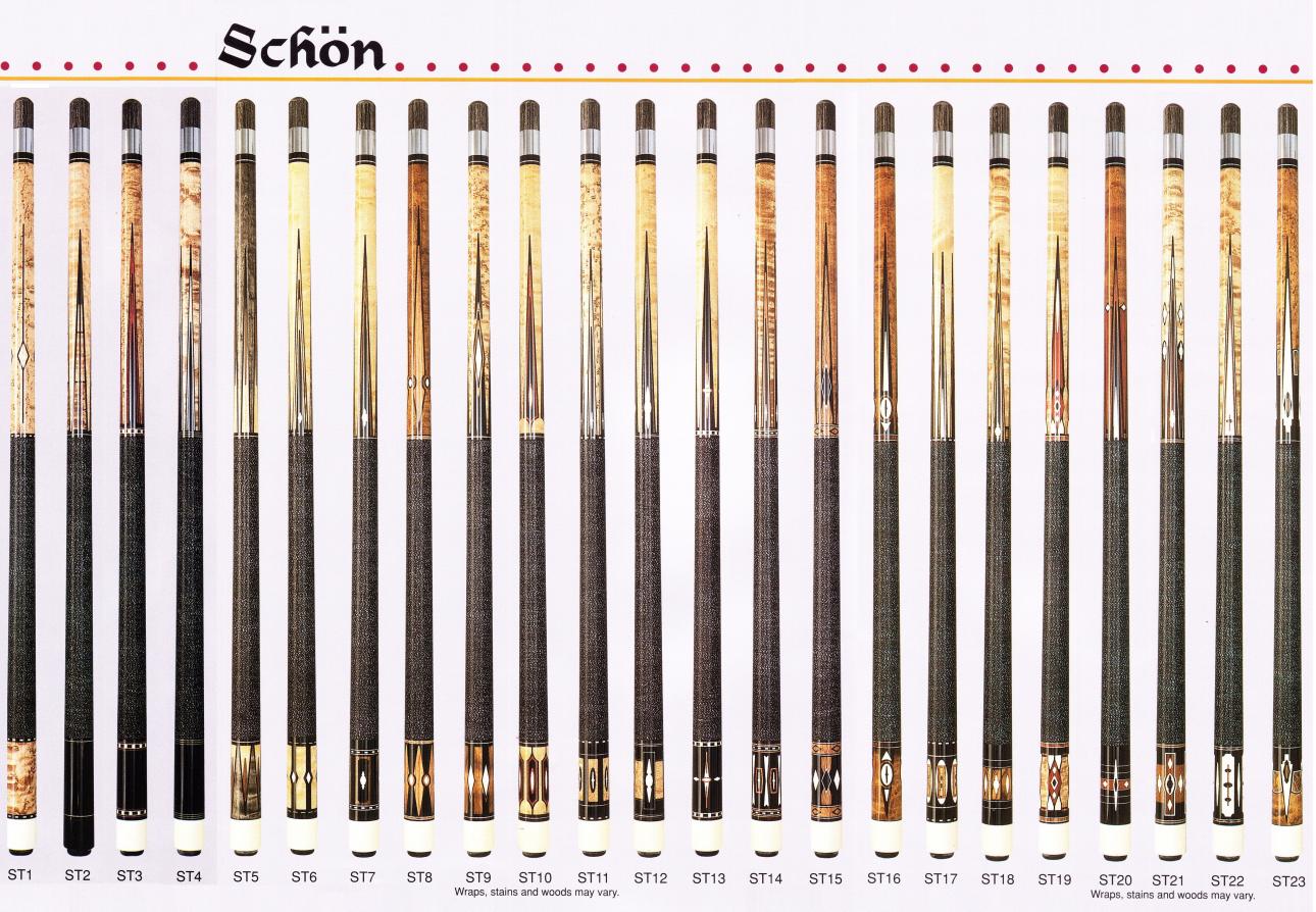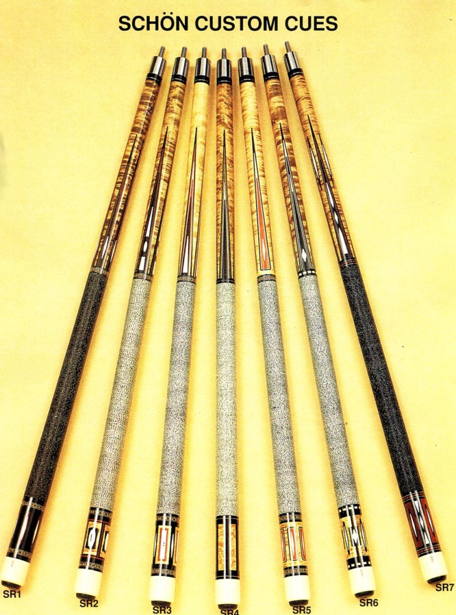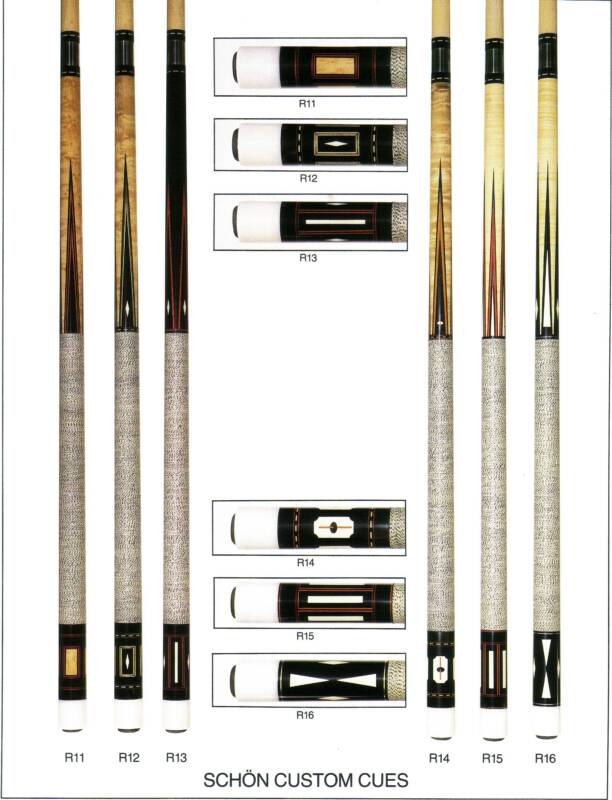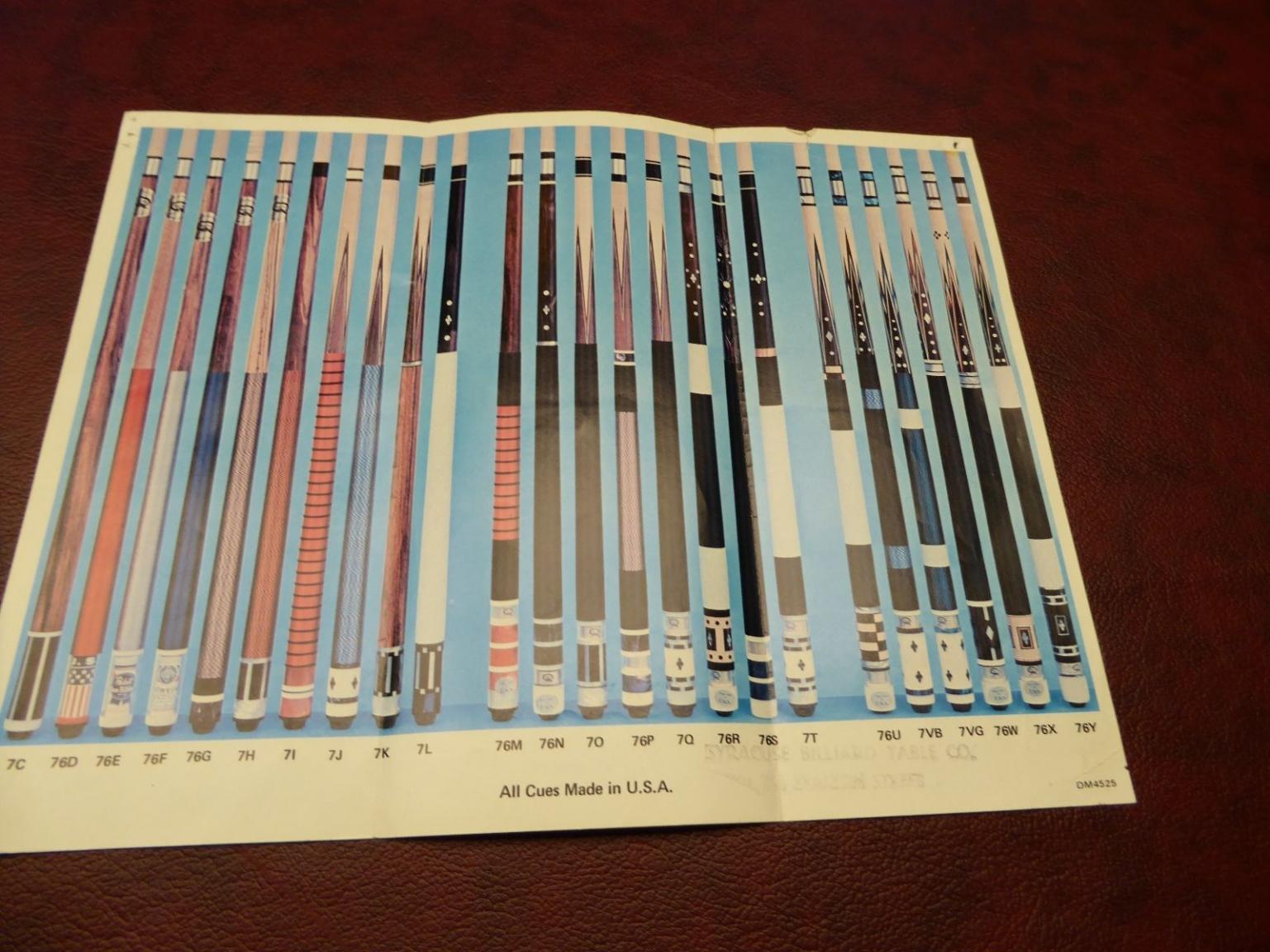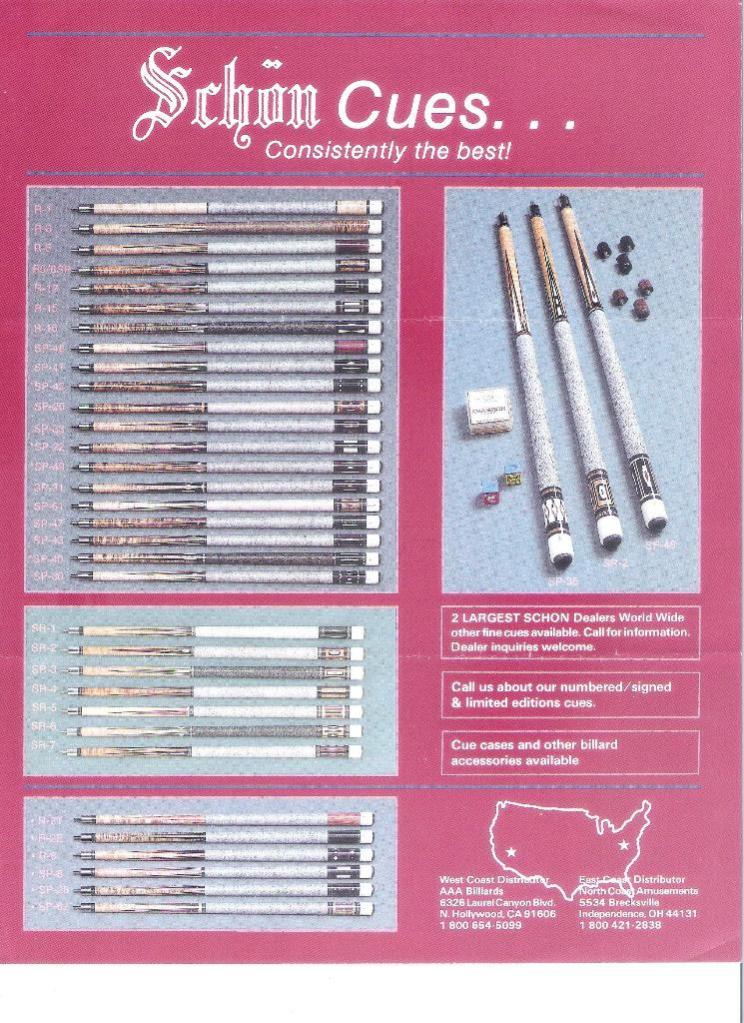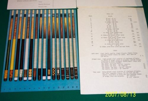 Over the years I have purchased or downloaded old brochures from custom cue makers and production cues from the 60's, 70's and 80's. I'll post as many as I can, I also have Schon's first catalog and a Barry Szamboti catalog in envelopes which I'll try to find and take pics of.