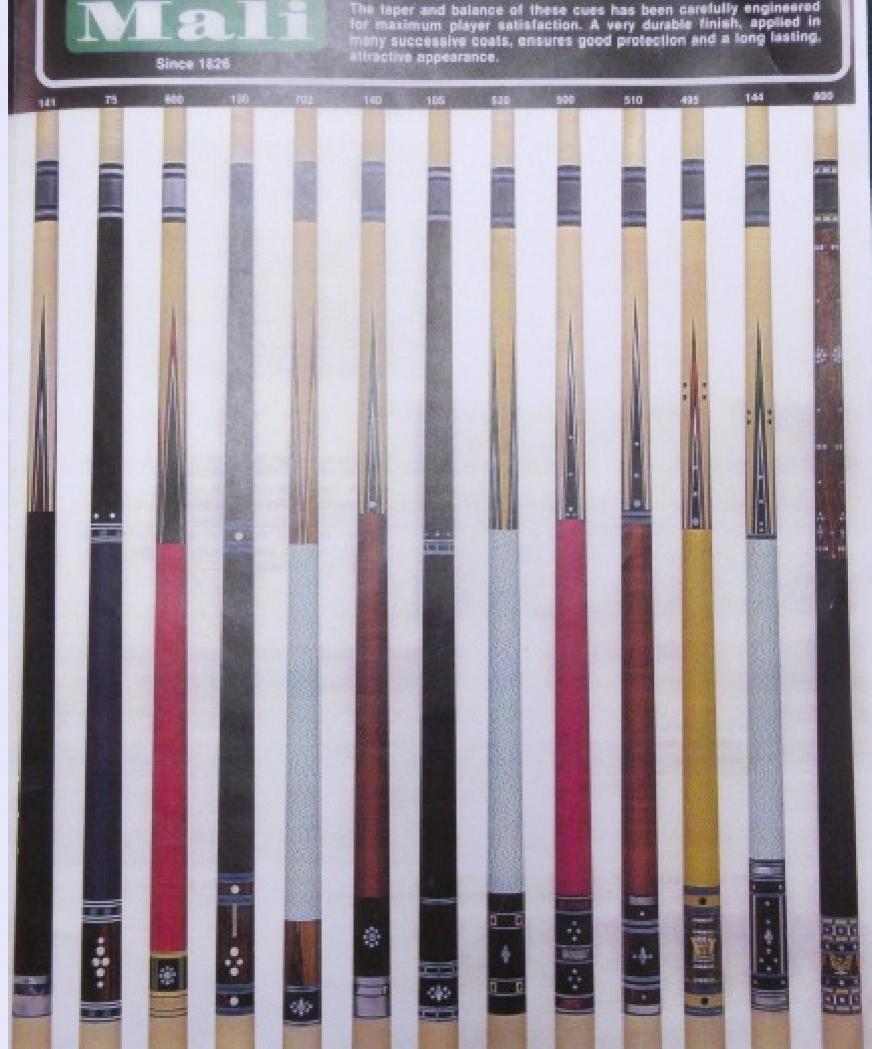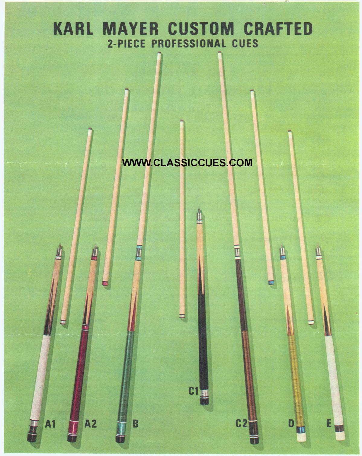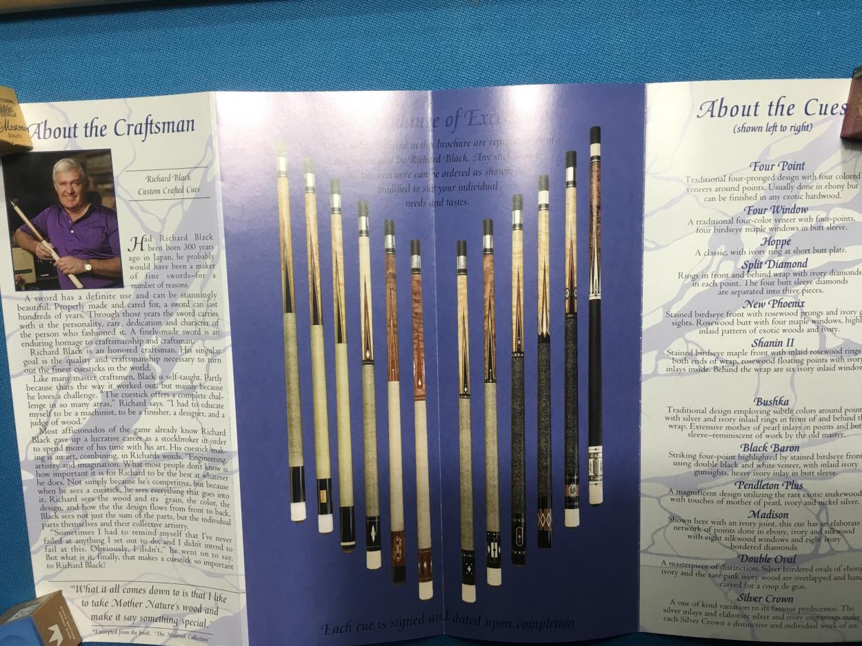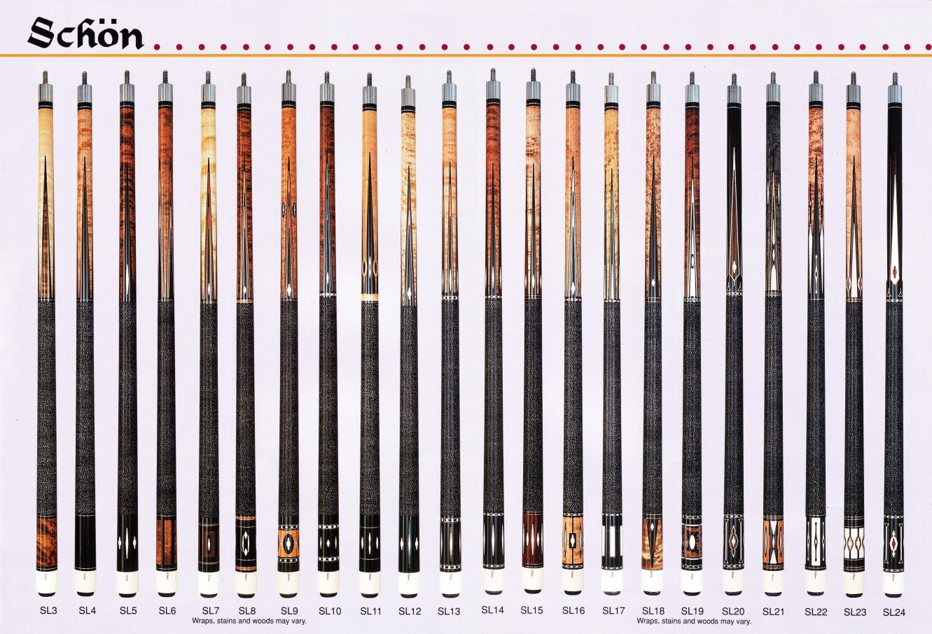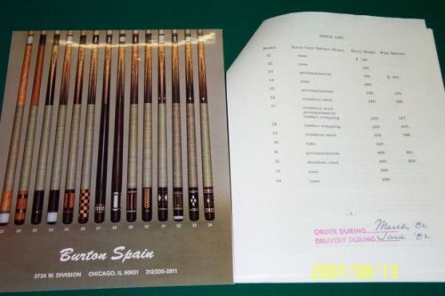 Over the years I have purchased or downloaded old brochures from custom cue makers and production cues from the 60's, 70's and 80's. I'll post as many as I can, I also have Schon's first catalog and a Barry Szamboti catalog in envelopes which I'll try to find and take pics of.