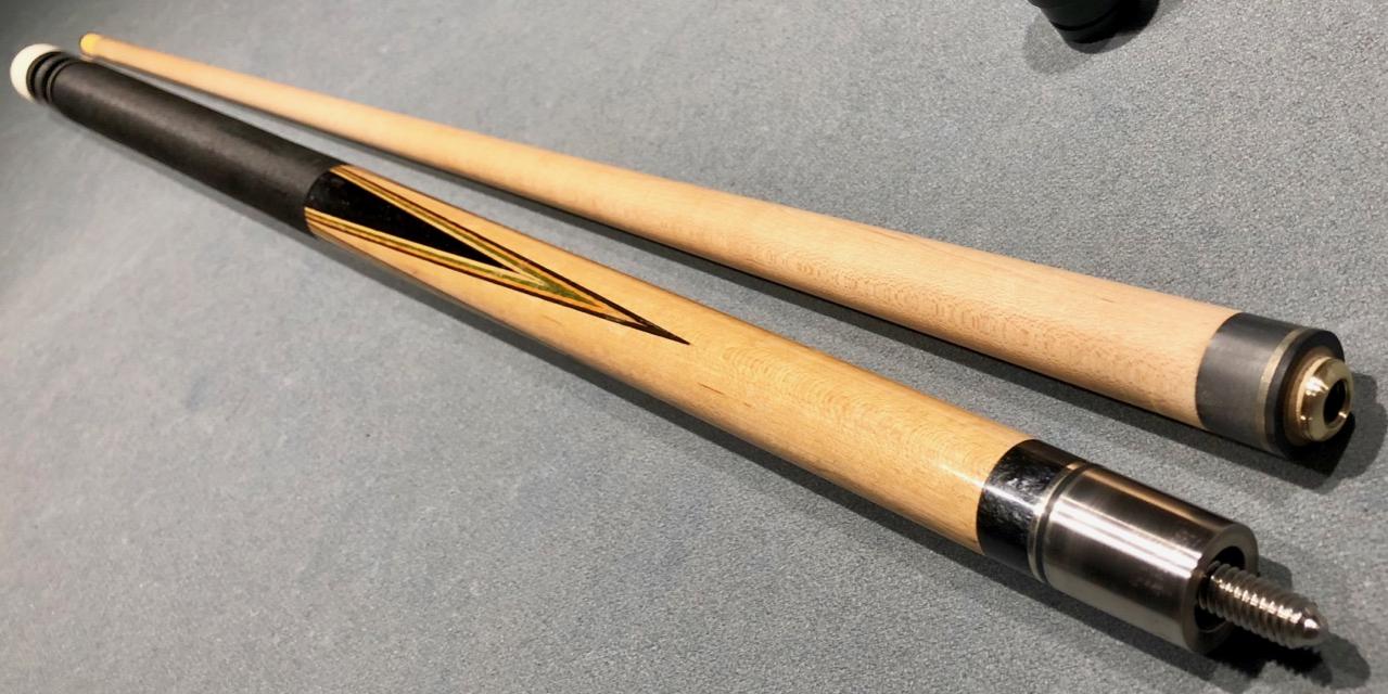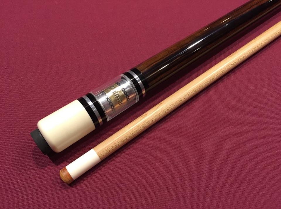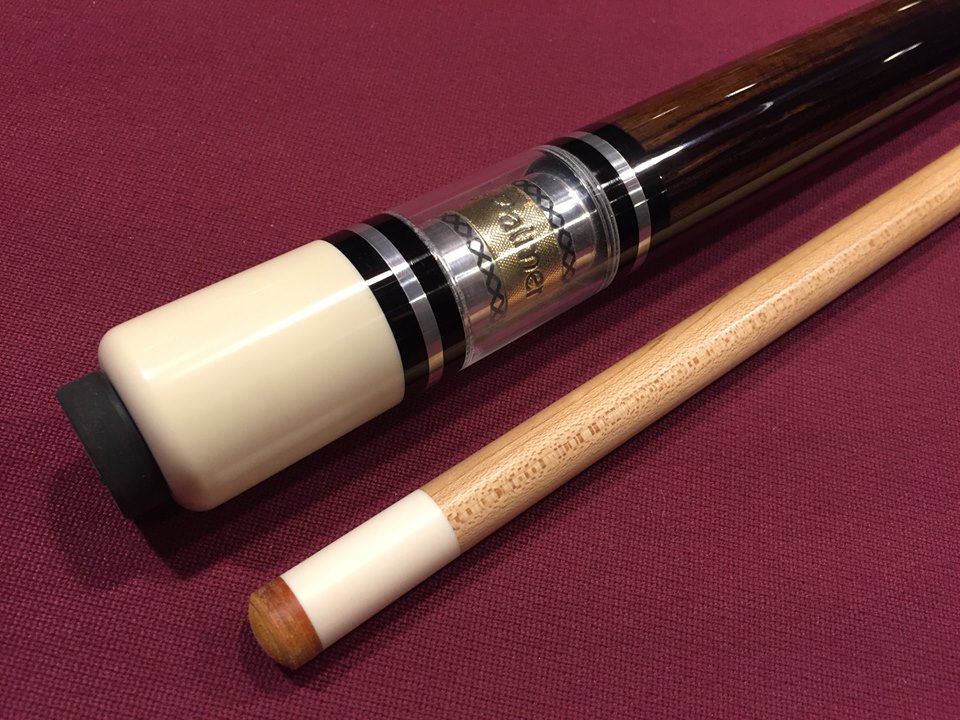 The Paradise is original. I purchased the Palmer already refinished with an incorrectly shaped replacement butt cap and non-original black wrap. After speaking with the second owner of this cue who bought it from the Gartner family, I was able to determine that the cue was originally wrapped with green speck linen and that the 13.75mm shafts were original to the cue. The case is a modern case and not original to either cue.