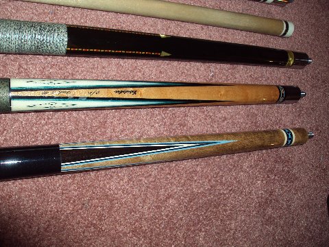 The other cues meaning the inlayless cues? The M is a friend of mines, if I see him I'll ask if I can take a pic, and the 19 was actually an 18. I believe there are two 18's, one we see at the show yearly, the other actually has one inlay in the handle and I think Tate owns it.