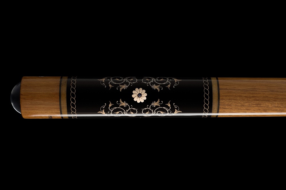 Its ornament is made of fine gold and silver plates, the thoroughly elaborated and hand-carved 1128 inlays and the 20 sapphire marquetries give the cue a remarkable sight.