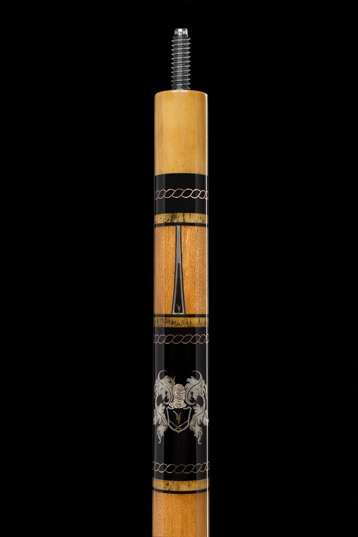 The cue, which revives the spirit of the age of knights, has been made with the inlay of gold, silver and some sapphire patterns, and with the use of pieces of antlers and leather.