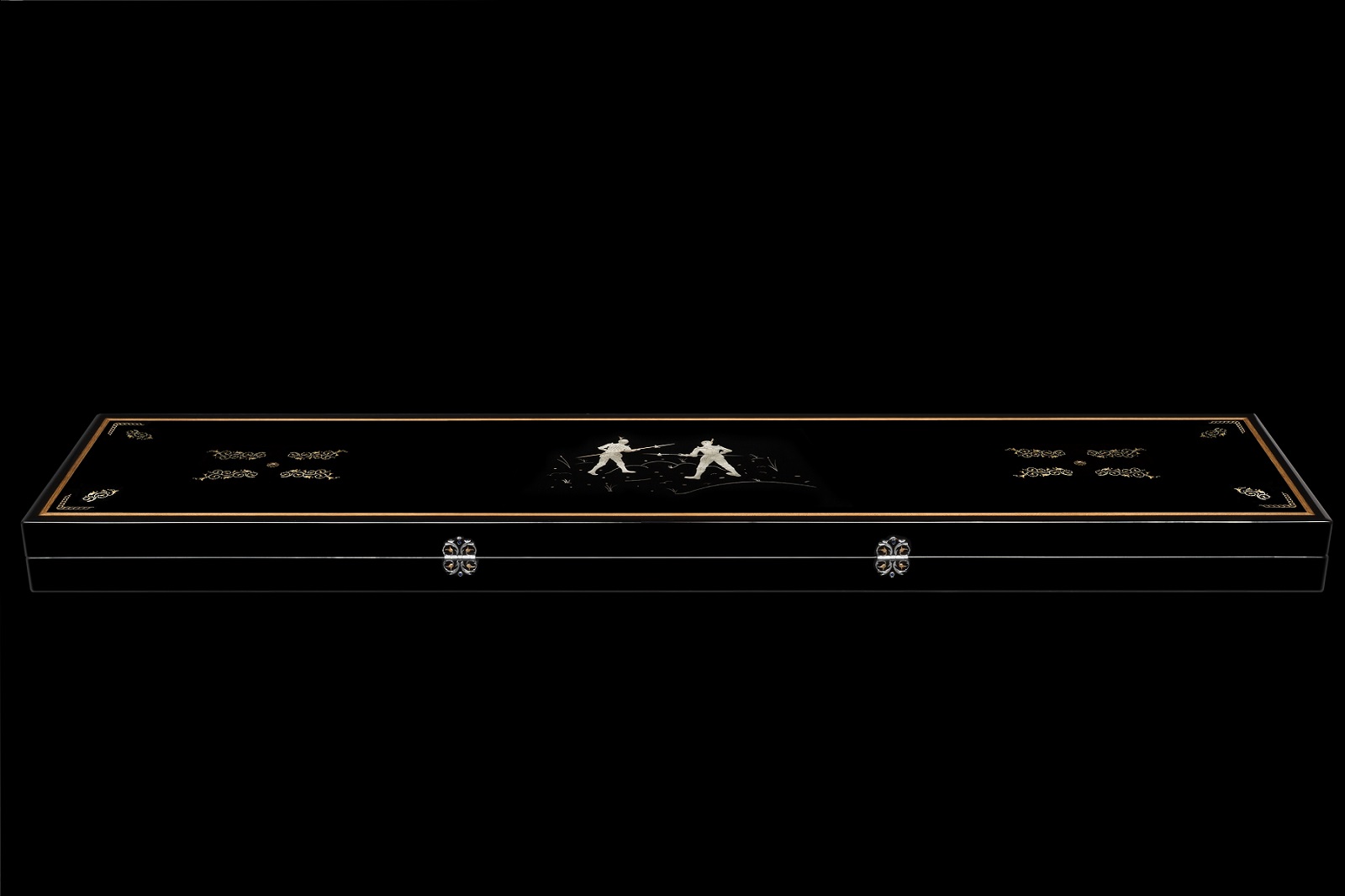 It has a hand-made wooden box covered inside with leather-work and it is also decorated with inlays. Its silver hinge has a sapphire chasing with a flowery pattern. The chasing is painted with high gloss lacquer coat and it is nicely polished. All these features make this cue unique and highly elegant.