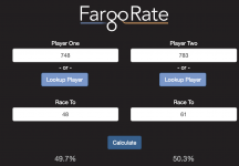 Well Fargo did NOT predict a blow out. it predicted odds of 54.5% for Donnie to get to 17 and 45.5% for Siming to get to 21 as the closest to 50%. And as Mike has explained there is some variance in the rating, but has not disclosed how much, only to say that the more games a player has in the less variance there is. I.e. the more games in the MORE ACCURATE that the rating is. So that said, every single player here who gambles has heard the phrase outrun the nuts. It means that when one side has what appears to be the very best of it, then if the other player manages to win then he "outran the nuts". If that never happened then there would be very little action because most players THINK that they have the nuts when they match up and when a player thinks he is in a match where the weight is too much but he wins anyway then it only encourages people to keep playing, the guy who outran the nuts wants to play more and the person who got the nuts wants to play more if they they think they should not have lost. The race length that made it 50/50 were more likely closer to 21-17.5 and the actual scores were 21-20 and 21-19. Which means that Chen VERY SLIGHTLY underperformed and Mills very slightly overperformed using the Fargo predictions and that both of their performances were well within the range of variance allowed.
