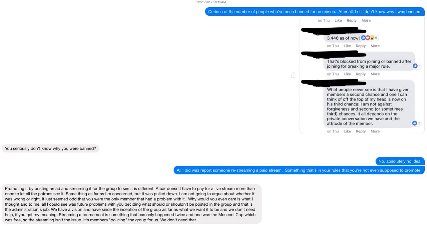 A couple months passed. A friend of mine sent me a screenshot where the group creator shared how many people were banned from the page. Given the trivial and asinine reasons I've seen when people are banned, I wasn’t even be surprised that this number was well over 3,000. Since he was so open to second (even third!) chances, I thought I'd message the group creator again and find out just why exactly I was banned.