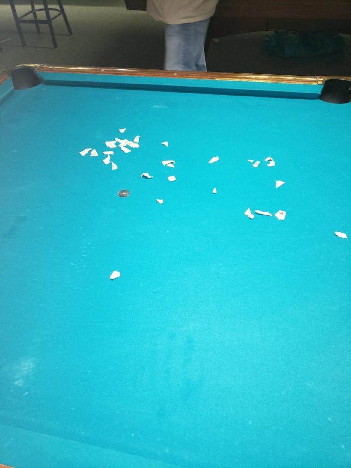 We're playing a set of 9b and he's giving me a generous spot racing to 7 for a c-note. I win 7-1 and he's extremely unhappy about it and shows it by banging his head hard on the slate a few times and grumbling. He throws my hundo up on a nearby shelf and starts to collect his gear. :angry: