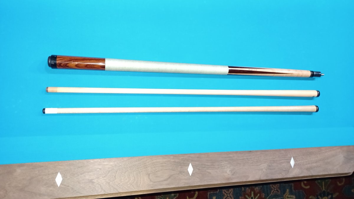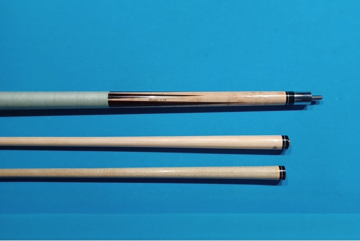 Cue made by Dan Prather (Father) not Jeff Prather, cue is a player, signed and dated 1994. 6 Points 3High/3Low, cue is maple forearm and coco points, comes with first shafts, and almost new OB shaft, wrap is Irish Linen w/ green specs, OB shaft test hit ( refer to pics). Cue is not perfect, has nicks, on butt in finish from actual play, forearm though is perfect, cue is 8+ of 10. Shafts are straight as is butt. This is a playing mans cue.