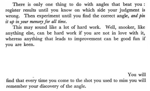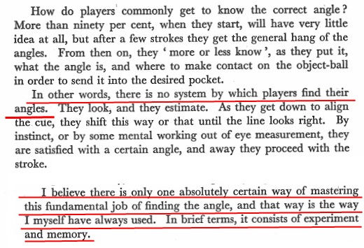 I happened to look through a book, kind of snooker instructional. Mind you, it's ca. 1950, and I was amazed by several very up-to-date statements from the author. I felt I should share at least some of them and highlighted the most interesting parts (though all the extracts I put here are worth reading).