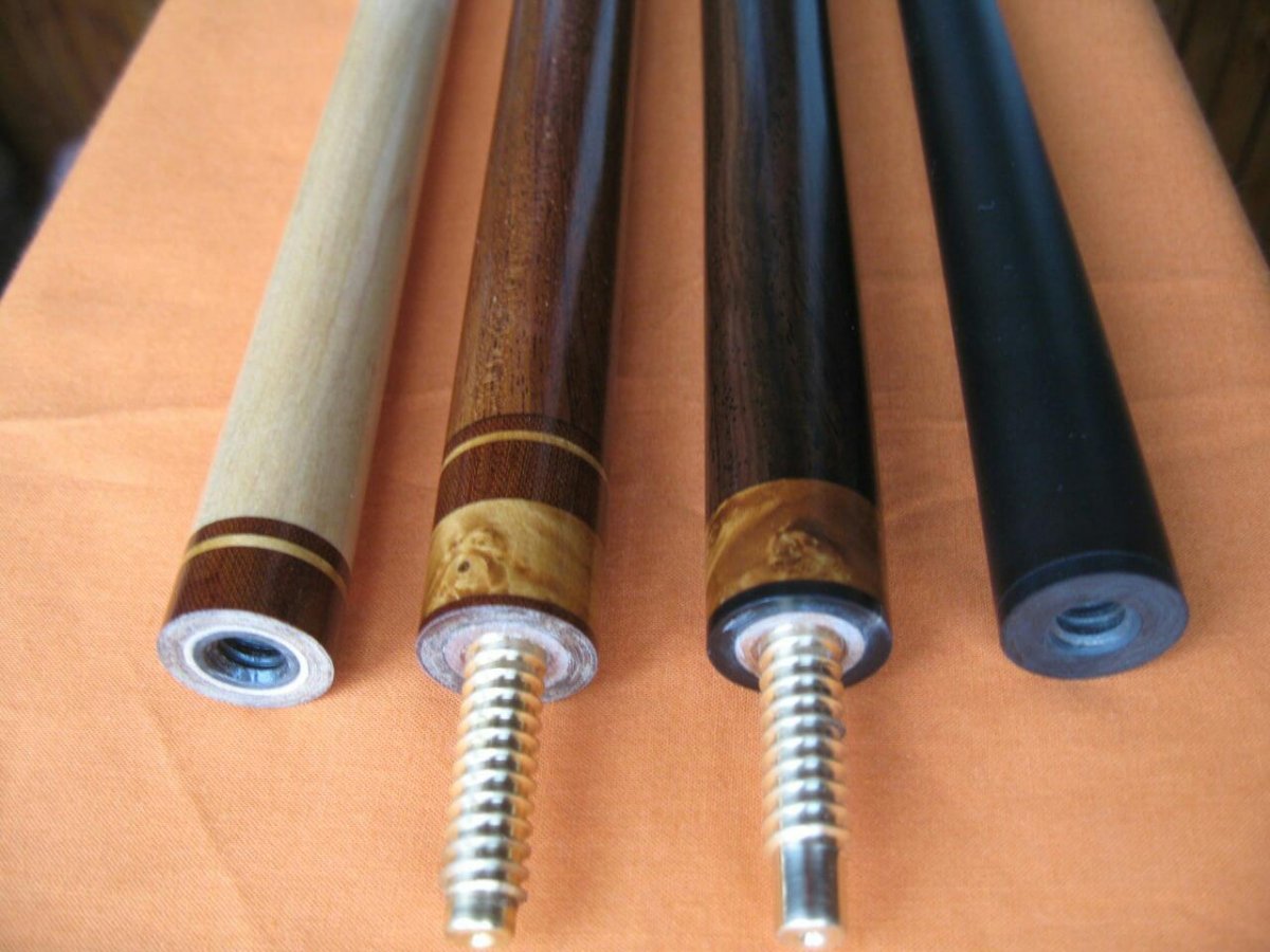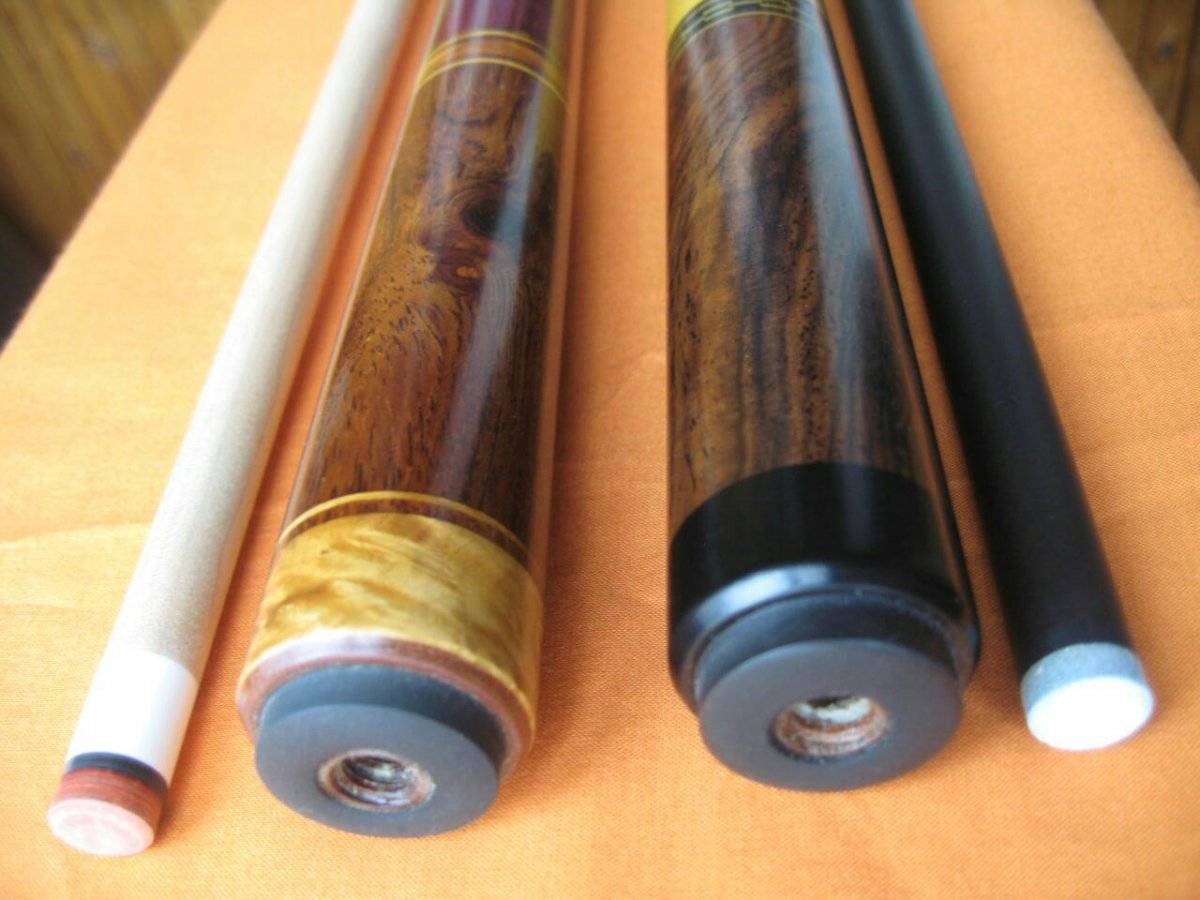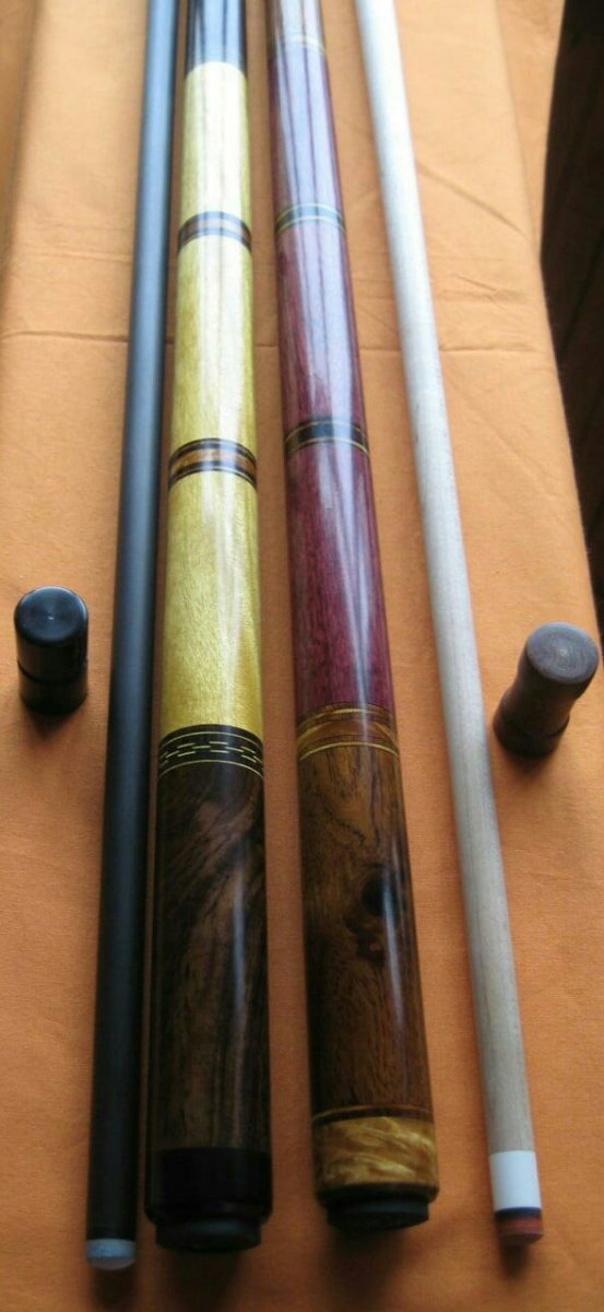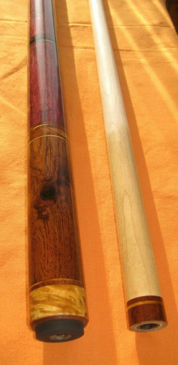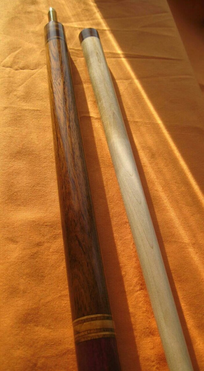 I always test my cues at the table and it was very informative experience this time. The reason being…both butts came out exactly the same natural weight of 435 gramms and balance. Both were built using the same construction on a full length maple core (out of the same board, same dimensions, taper etc.). The major difference is in the wood's combo for the forearms/segmented handles/butt sleeves.