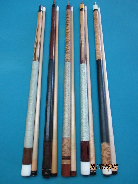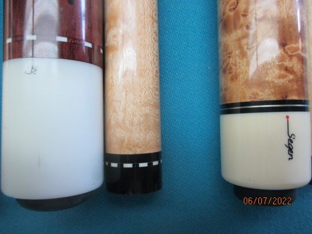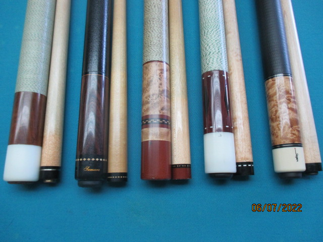 I am thinning my herd of cues and will be posting a few for sale from time to time to see if they interest anyone on here. I pride myself on having all good playing cues. That's what they are made for after all. These first five cues went on sale online two days ago and the Joss West and Verl Horn copy have already been sold. From left to right in the first two photos are the Verl Horn "Balabushka" copy (now sold), a very nice Samsara cocobola cue, a sweet hitting Ned Morris cue, a vintage Joss West cue (also sold) and a Segen cue made by Evan Clarke of Schon cue fame. My pricing on these cues is very fair but I am open to offers. I am not interested in any trades thank you. All cues are in excellent condition! I will accept cash, check or paypal (you pay the 3% commission). I will pay the shipping costs on any full price sale. If you have any questions I can be reached at jayhelfert@yahoo.com or (310)370-3994.
