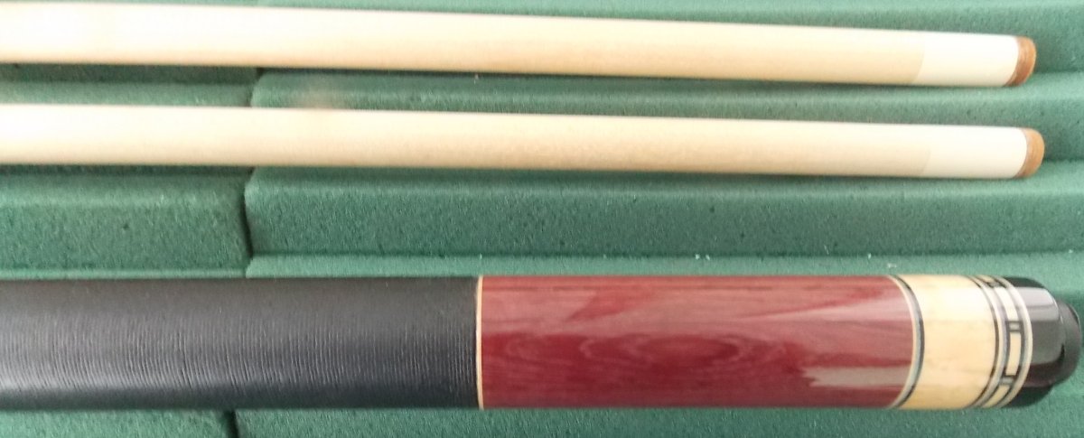 excellent condition, .Birdseye on Purpleheart, black, blue, natural veneers, black linen. SWC butt cap, 2 cactus