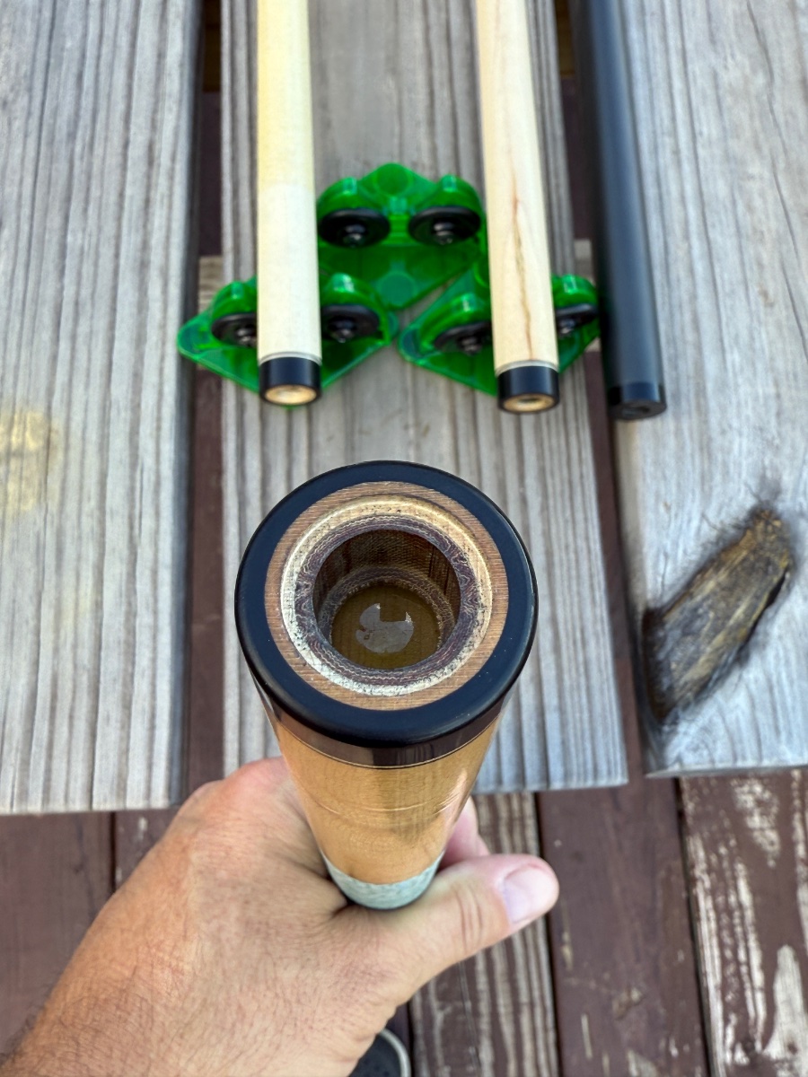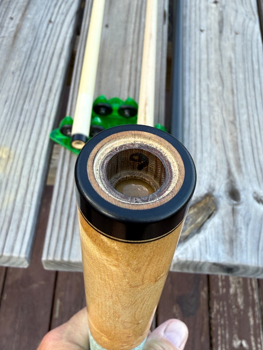 It comes with 2 South West shafts, with one being the original shaft based on a similar “6” marking on both the shaft joint and inside the butt cap. The second South West shaft is marked with an “F”, as per their typical identification marks on the shaft joint.