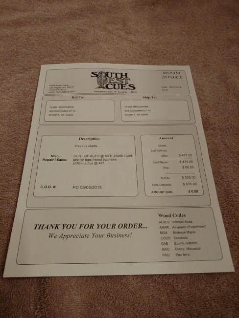 Beautiful SouthWest cue in like new condition. Classic 6 pointer with African Ebony and BEM. Rings at ABCDE and the cue weighs 19.75 oz. and is 58" long with original triangle tips. I have the provenance of the cue since it came from SouthWest. The cue comes with custom joint protectors which cost $475, with the receipt from SouthWest. The serial number is 34206 and the cue rolls straight together and apart. I have a COA from SouthWest, Laurie Franklin, along with a description of the Cue. Shipping will be free in the CONUS and will require signature confirmation. The wait for a new Southwest cue is 12 years, no guarantees any of us will live that long. The only trade I may consider is a plain jane cognoscenti shooter with money coming my way but prefer straight up sale.