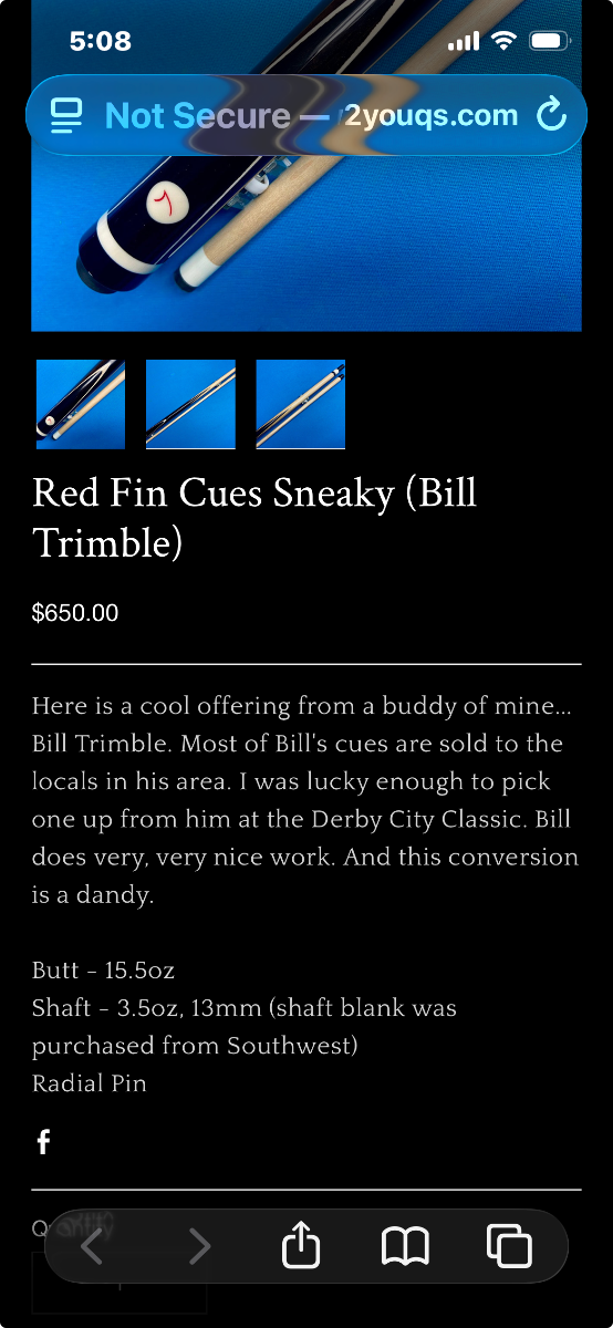 Just picked up Bill Trimble ebony conversion cue that came with this shaft. It’s a blank purchased from Southwest 3.5oz 13mm 29 inch. Brand new, never chalked. I am using Revo shaft with the cue. Looking for $200 shipped Venmo. Includes joint cap. I bought the cue from Worminator who can verify.