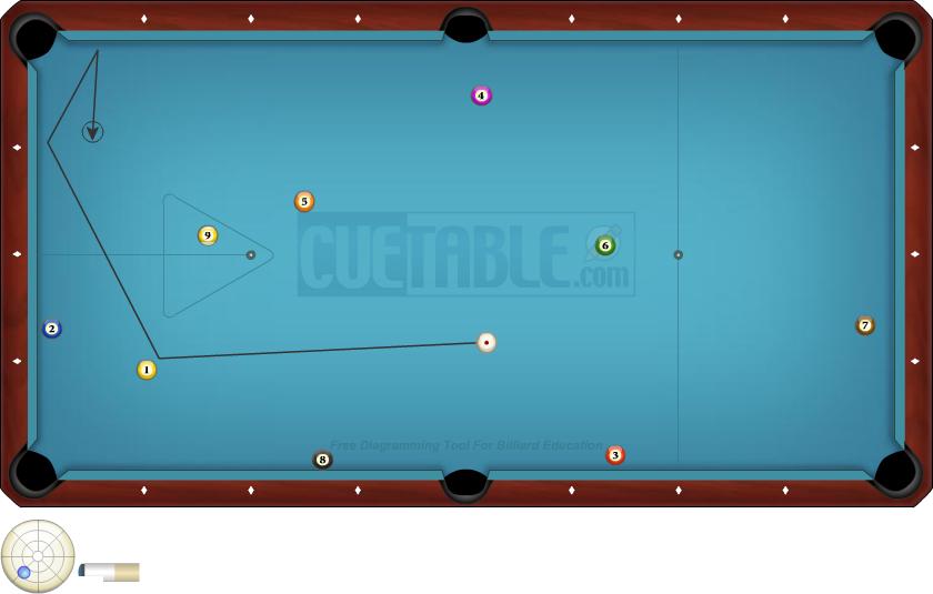 Draw Rail Kick for straight in shots. Not sure if I've drawn the best situation where this shot is useful to have in your arsenal... in the shot I diagram you dead stright onto the corner with the 6, no way to cheat the pocket... until a few year ago I had no idea how to execute this stroke... What I thought the logic would be was completely opposite.. I would thing to draw the cueball back to the bottom rail and have it kick into the middle of the table would be outside english of english towards the middle of the table... dead wrong.
