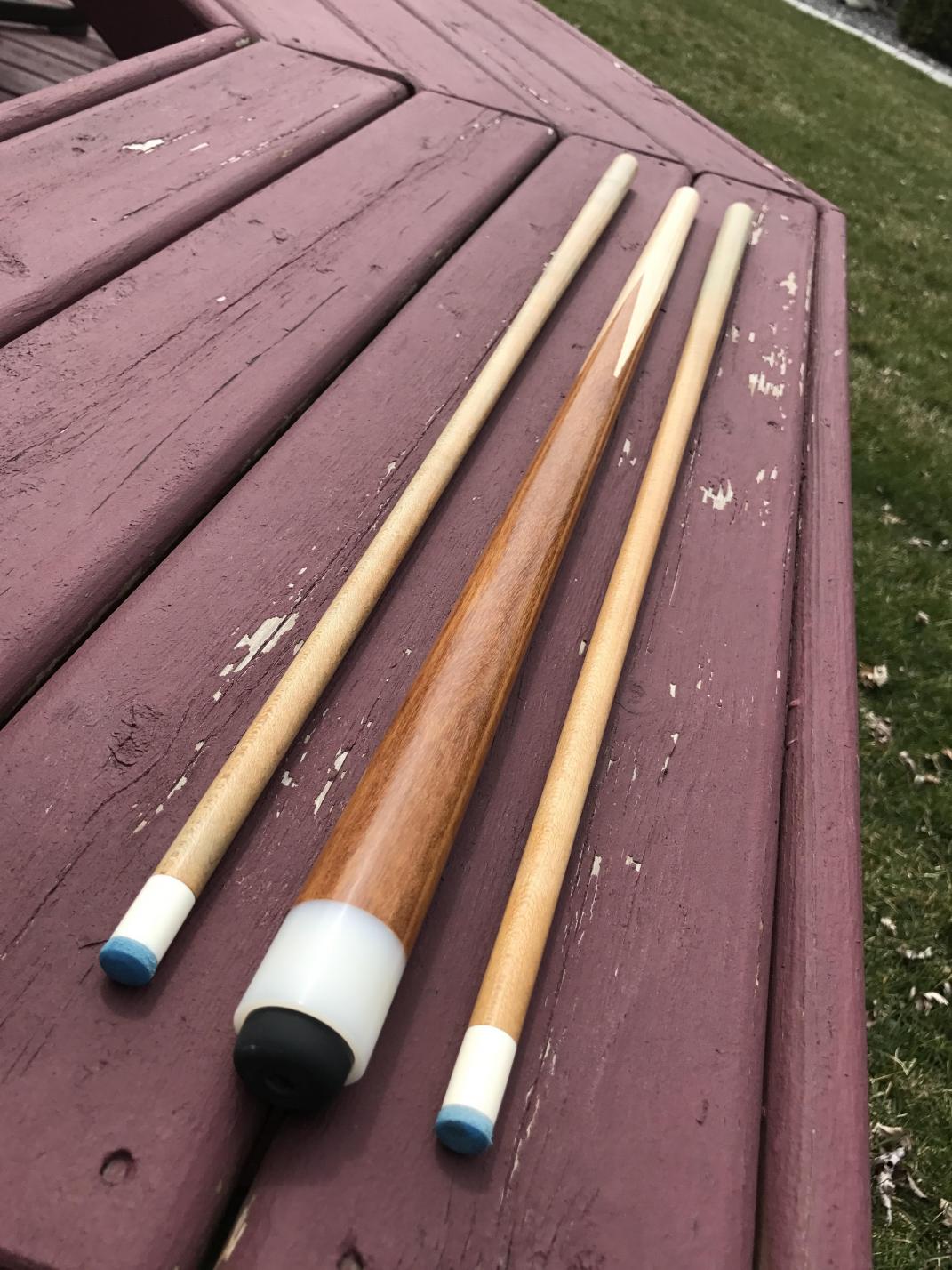 Beautiful sneaky pete made by Chuck Starkey. Butt and both shafts were converted from old 1950's house cues. Cue has two of the most beautiful old growth, dense, deep honey coloured shafts.