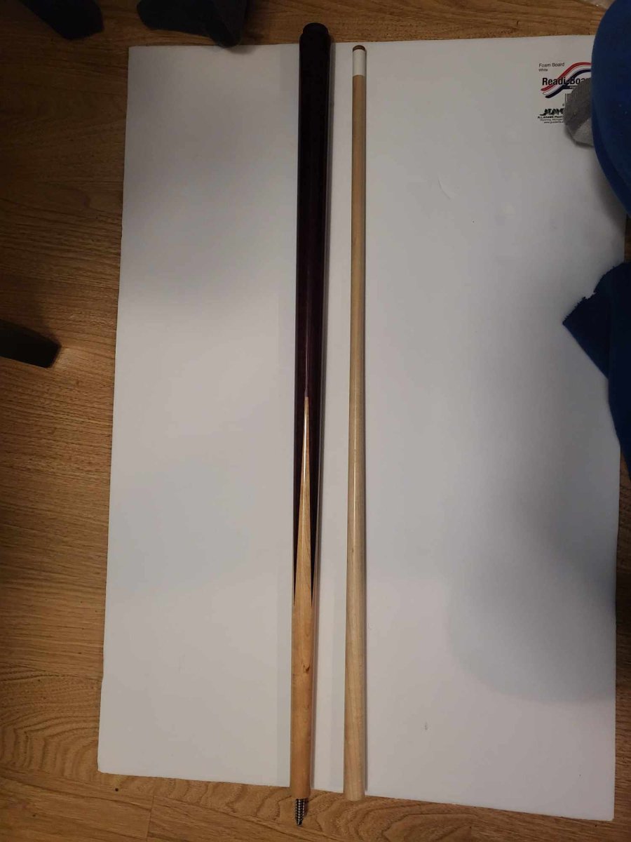 Used Stenback purple heart sneaky pete pool cue in good condition rolls perfect together and apart the shaft is smooth but the butt of the cue has some dings and scuff marks here and there, the weight is 18oz and is standard 58" the tip is a Dennis Searing medium and comes with joint protectors and free ship in the conus with UPS ground