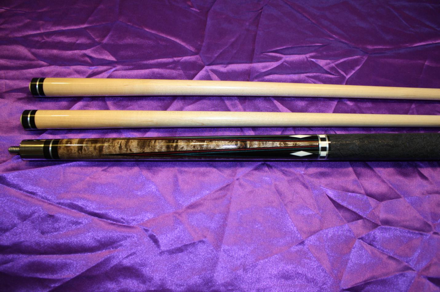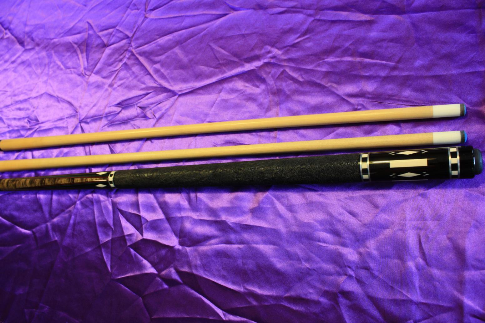 Stained curly maple forearm and Ebony butt ,cue is loaded with the white stuff and sports huge Buska style rings. Leather wrap, maybe elephant ear? I am no expert on leather wraps.