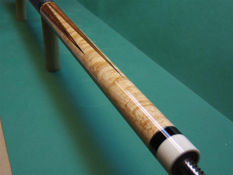 This cue was stolen in Mobile at the tourney saturday. It is birds eye maple with 3-High 3-Low points. The points are Lace Sheoak with black, orange, black veneer. It has a 5/8" ivory joint and 3/16" ivory ring at the bottom, with one butterfly point in the butt sleeve. It is signed Bill Webb in the point area and Webb is engraved on the end of the joint screw.