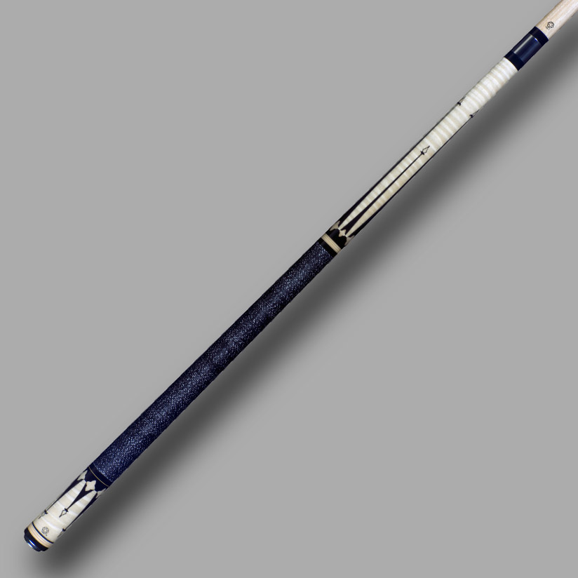 Our 408 J-Line Cue features a beautiful Curly Maple forearm and butt sleeve with a total of 12 ebony black points and maple sheilds. Each point is topped off with a small diamond of Holly set in a black border with accent flower petals. A black with white spec irish linen wrap takes care of the handle area while a polished steel joint and 5/16-14 pin takes care of the front end of the cue. At the bottom, you'll find our exclusive "signature" ring to round things out. The 408 is 58" long, and the weight is adjustable from 18 to 20 ounce.