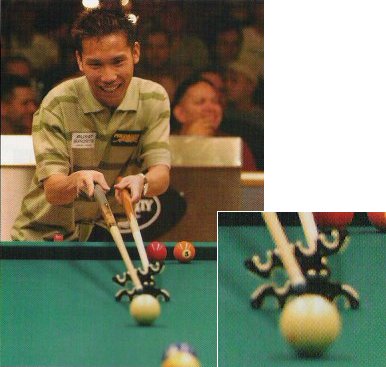 I play 14.1 frequently and have always had trouble bridging over the stack to shoot a ball into a lower corner pocket. This bridge has finally solved that problem.