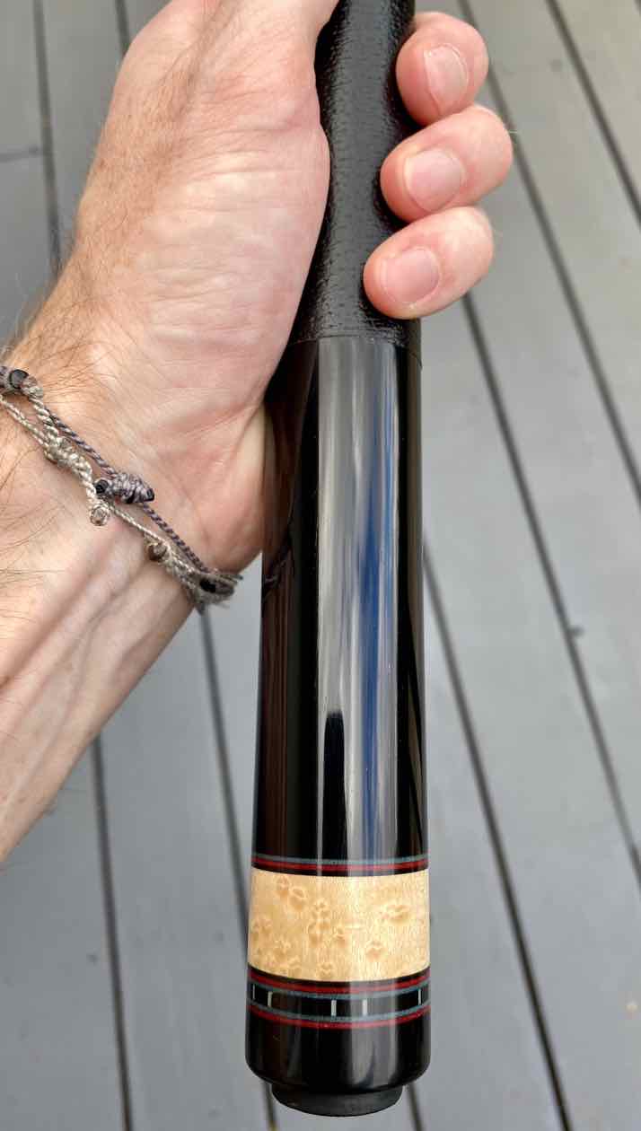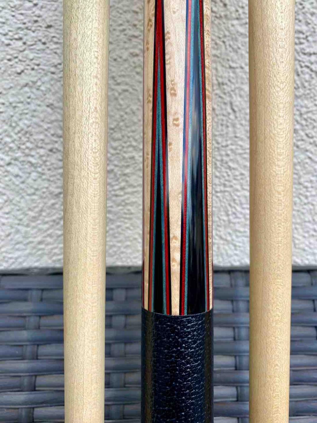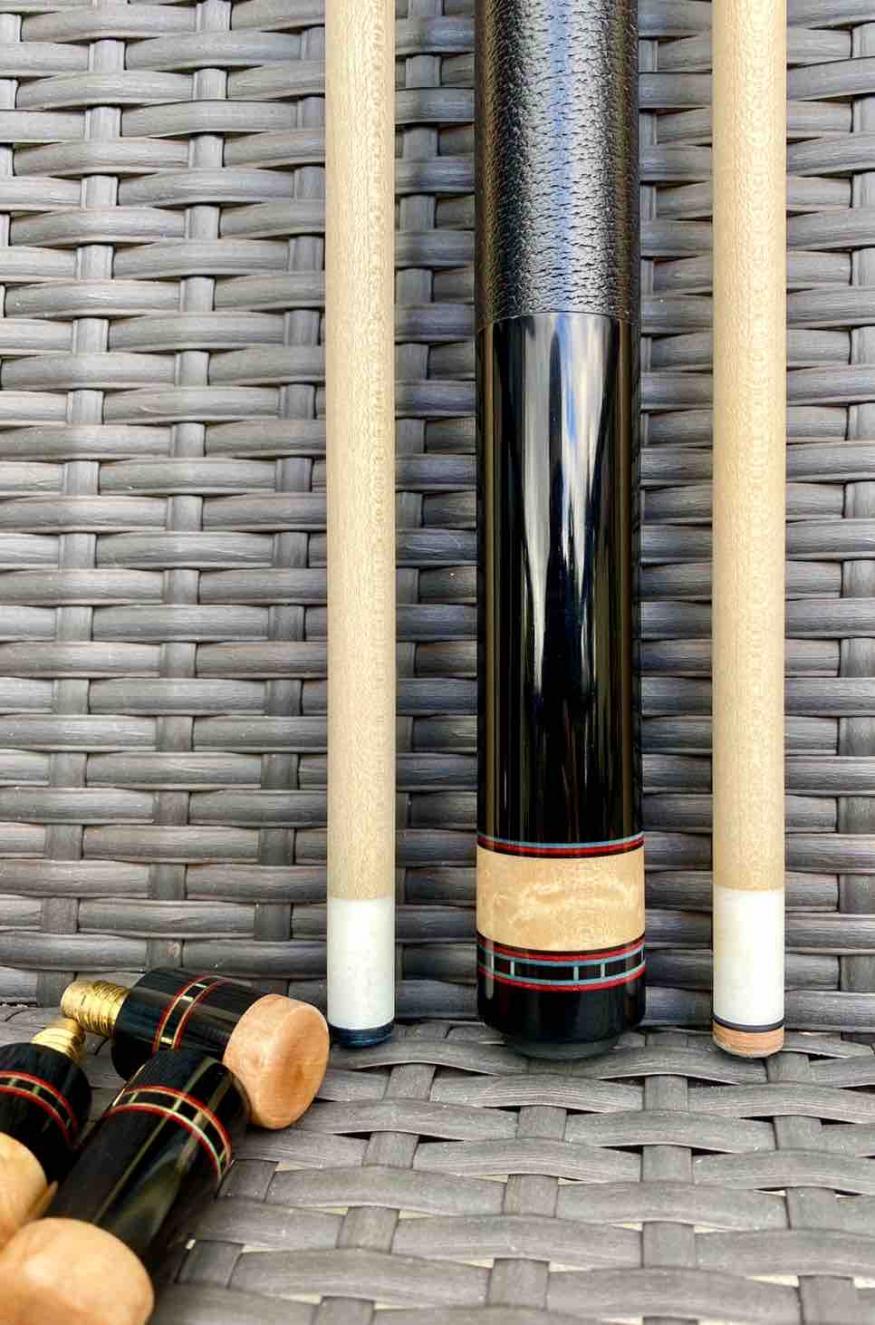 SOLD! Here is a beautiful SW player 6 pointer (3 high, 3 low) with a very nice leather wrap installed by Paul Drexler. Triple veneers - red, black, and blue. #369-11. Ebony butt and points into a very nice BEM. Everything rolls straight. Cue includes SW caps that I believe were made after the fact, according to previous owner. Cue is in excellent used condition. One shaft has bluing and was played. Still very good condition. The other shafts looks mint, and perhaps not played at all. NO finish issues on the butt, and no dings, dents, or scratches that I can find. Perfect weight and specs.