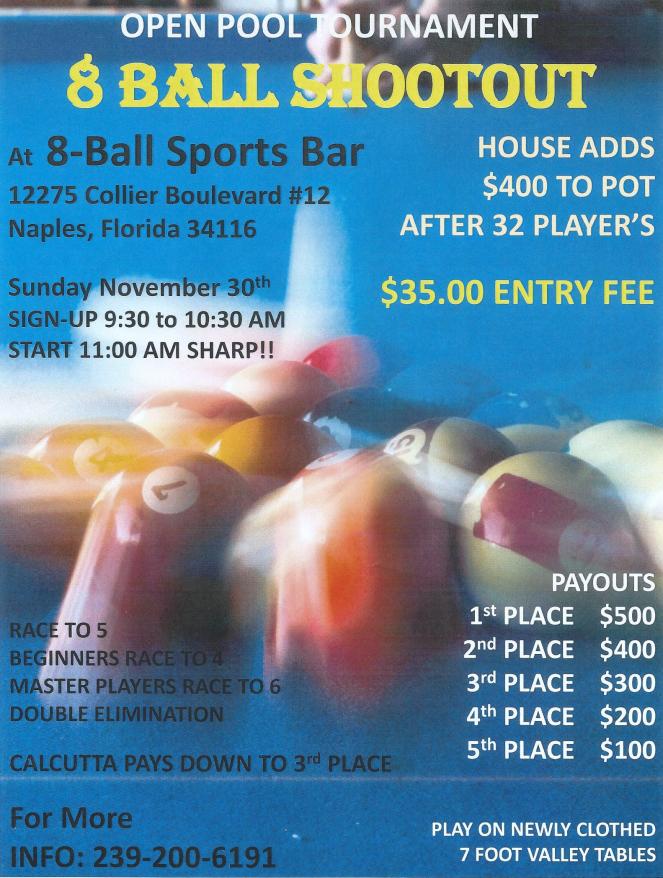 Please call Darwin for more information. Phone number on the listing. Just posting not affiliated with pool tournament.