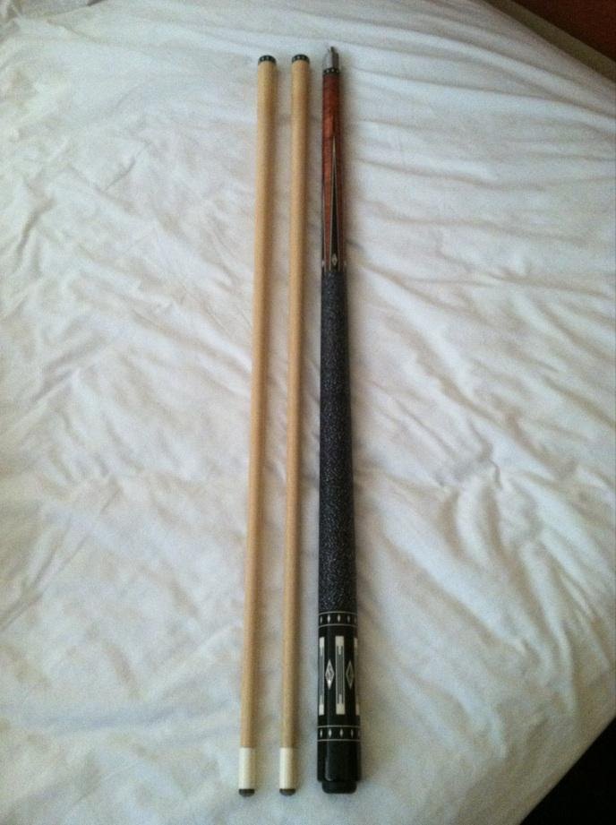 Cue has 6 ebony points in birdseye, ebony butt sleeve, 6 ivory windows w/ ebony line, 6 ivory diamonds w/ abalone inlays. 2 shafts and is 1 of 1, you will be the only person with the cue, period!!
