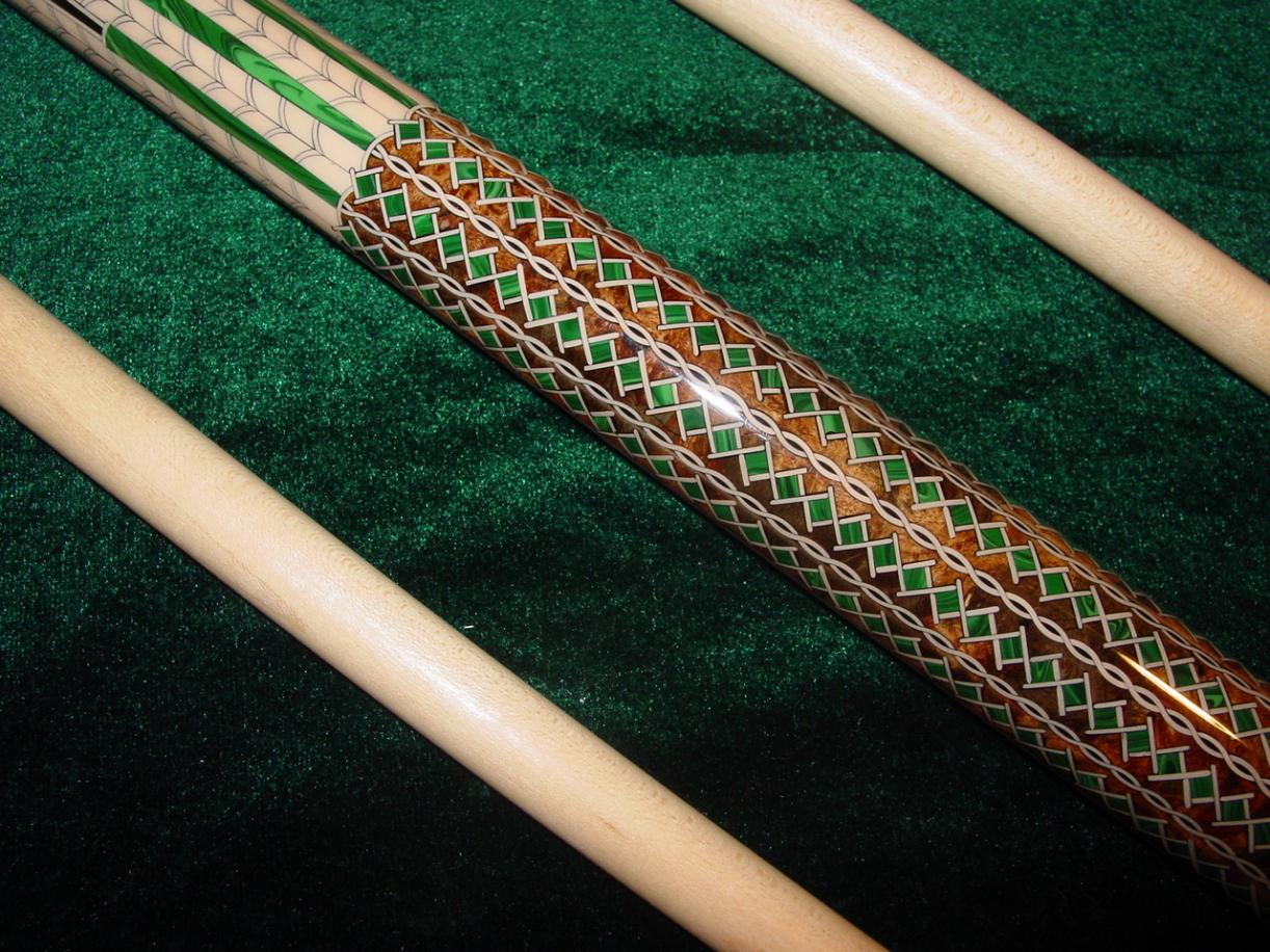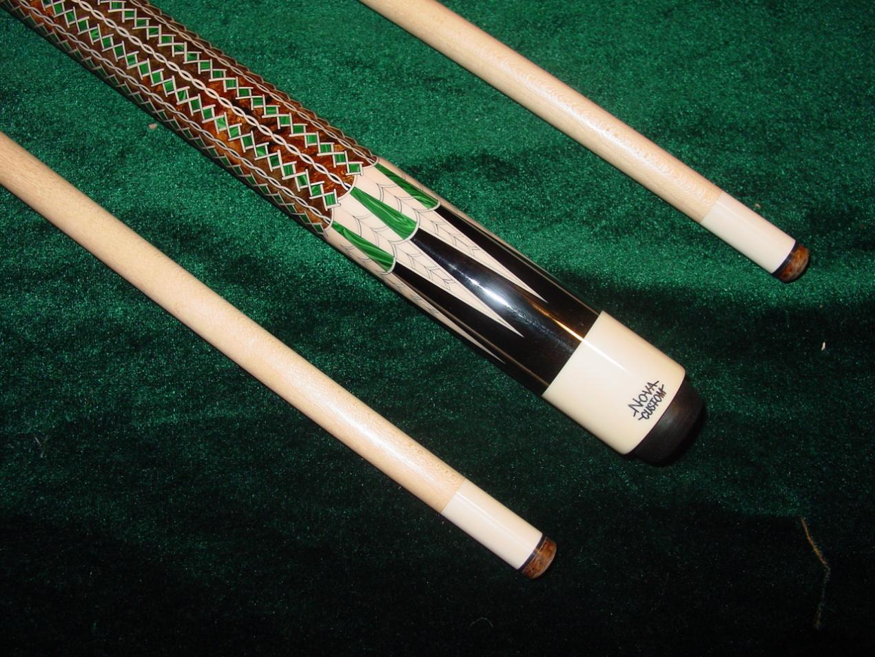 This cue has over 3500 inlays and was well over 400 hours to complete. This cue is featured in the color section of the Blue Book of Cues, second edition on page 80. This is THE fanciest cue made by the Nova Shop.