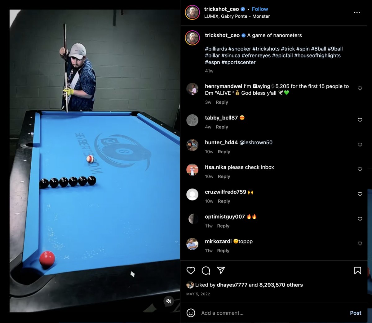 Pool just doesn't get the attention it used to get! Who cares - almost every sport/game is dealing with the same issue (ie. baseball). I work in marketing and consumer interest has simply become more niche and advertisers are following suit. Yes, pool needs more sponsors but you don't need big and recognizable brands sponsoring pool for pool to be successfully monetized. See attached screenshot - Trickshot CEO got 8 million LIKES (not views!) on this video. Between instagram, youtube, and tiktok he has 5 million followers. Even though trickshot CEO isn't really a pool player, he's influencing millions of kids who - guess what - will grow up and have hobbies - and maybe one of them will be pool.