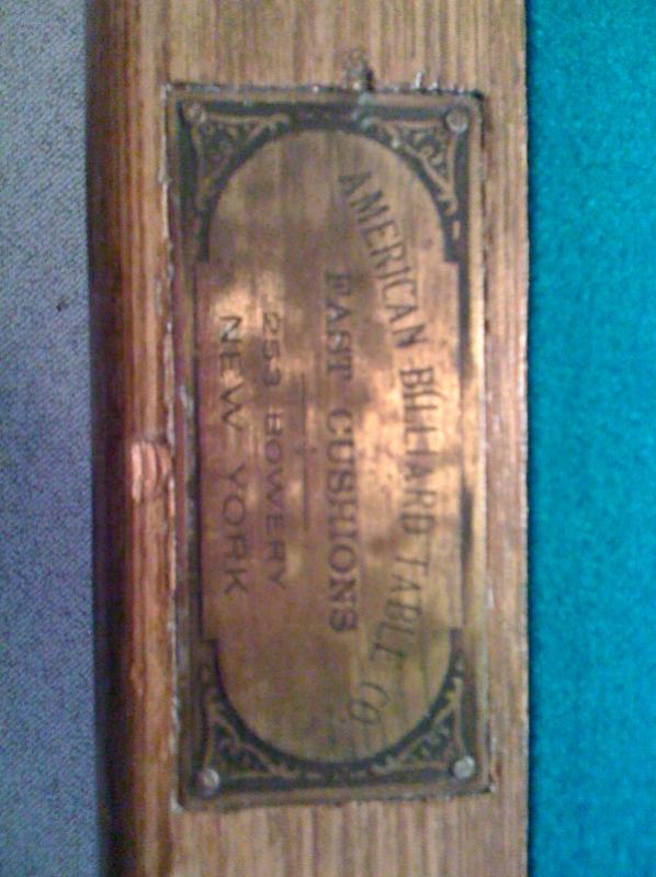 You can meausure the size of the name plate and go to a few website's to check deminsion's against to see if it's a Brunswick, AE or another brand. The name kinda reminds me of a shuffle board company that sold tables. The new company is American shuffleboard company and they bought out an old company several years ago about 10yrs ago. It jogs the memory a little from a trade show because I always ask wierd questions and remember off the wall answers.