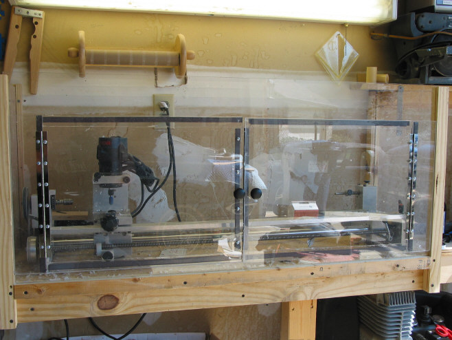I revamp my inclosure. First, after useing the machine awhile I thought it was a dumb idea to have the controller in the back of the machine where you had to reach over spinning objects to operate it. It could be dangerous! More than anything it was an inconveience when the cut is finnished on the left side. I relocated it in front and outside the box. I also made a cover to protect the motor somewhat and a place to keep allen rench for head pin