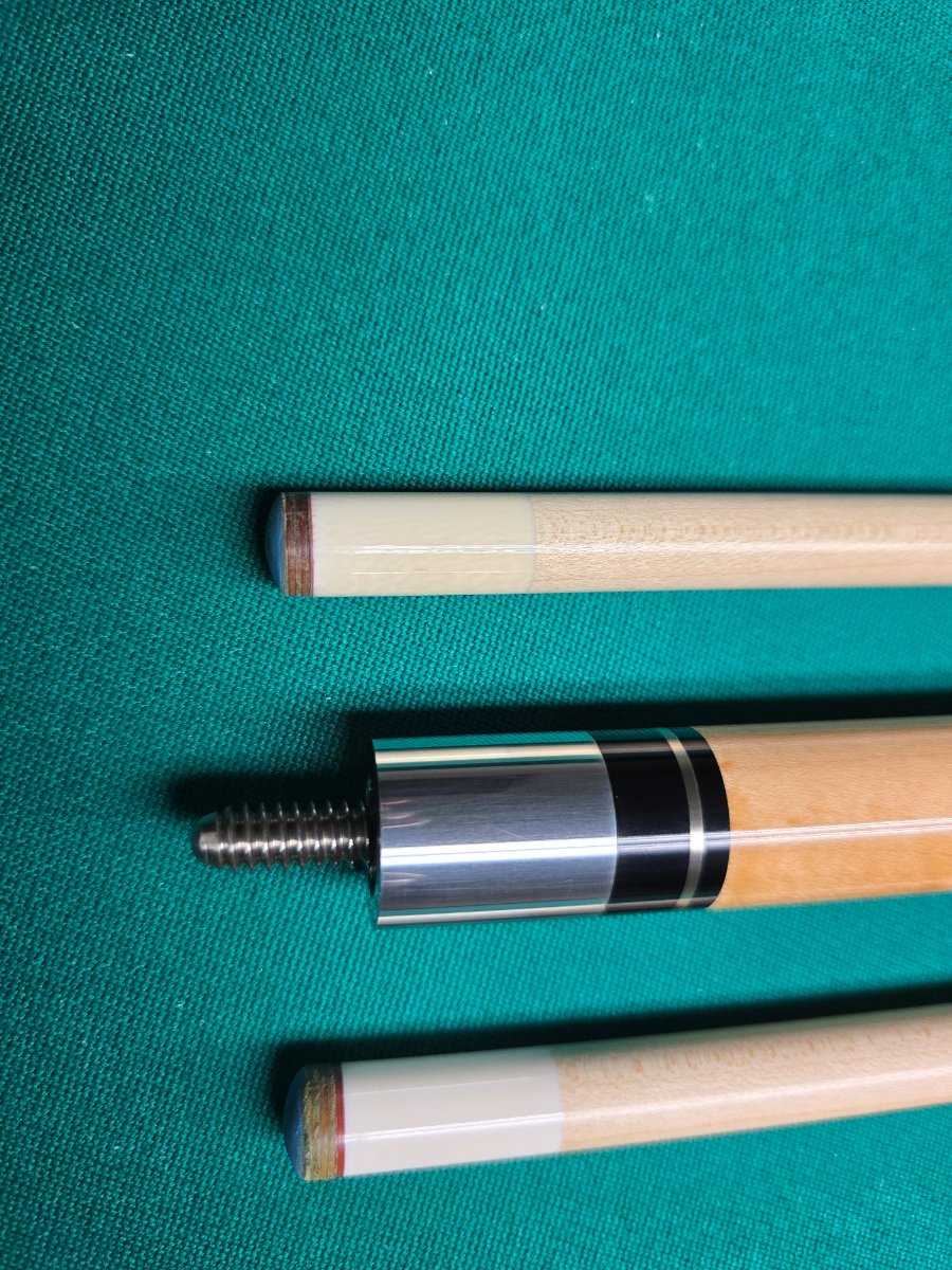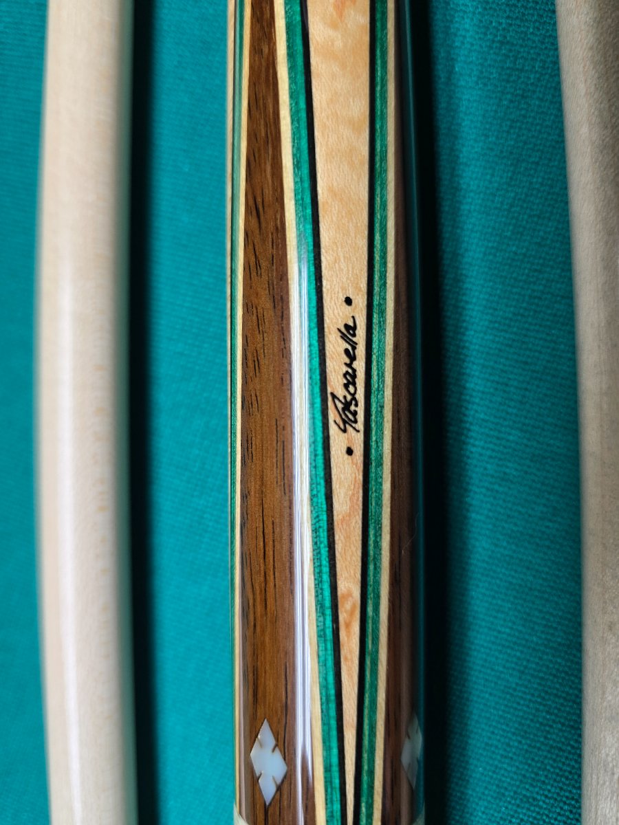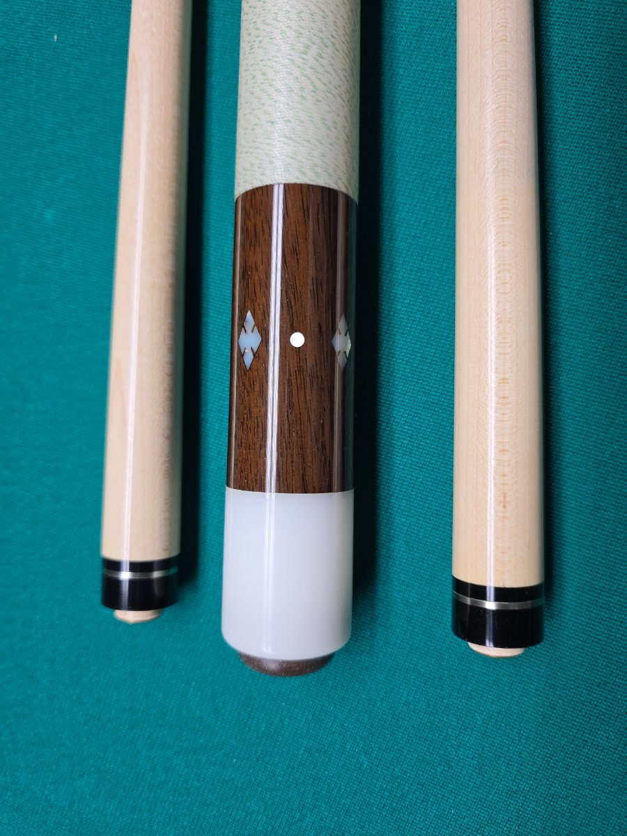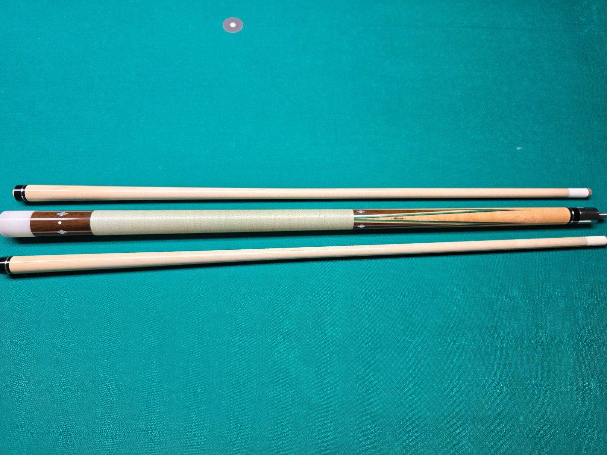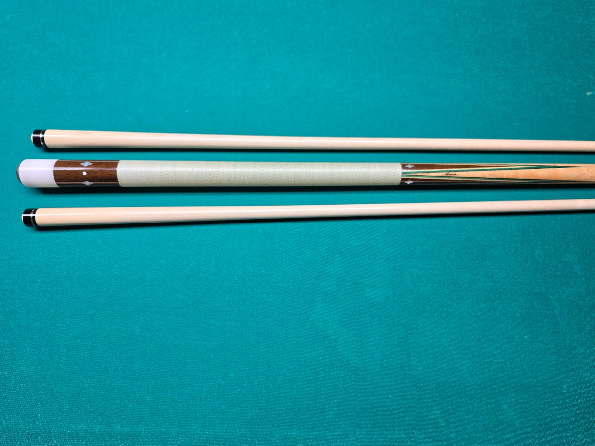 This cue is a prime example of Pete’s work. The cue points are absolutely perfectly made with Brazilian rosewood. It is a piloted 5/16-14 steel joint. Mother of pearl slotted diamonds in points and butt sleeve. Delrin buttcap. Two 13mm shafts with ivory ferrules with triangle tips. Everything rolls straight, apart and together. There is not a dink or mark on the butt or the shafts. This cue is absolutely mint. Beautiful Irish linen wrap that looks like it could have come out of the shop yesterday. The Butt 15.1 oz. and shafts are both 3.7oz. 3.7oz $3,750 o/b/o.