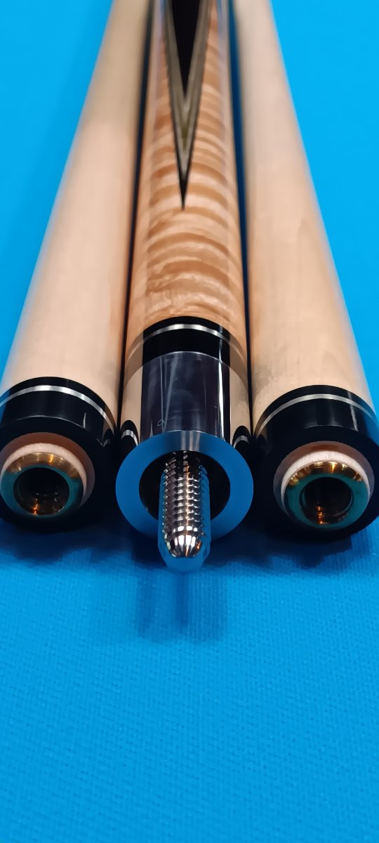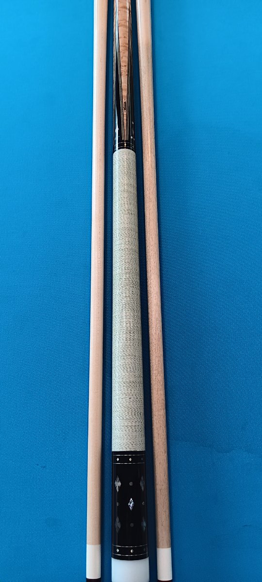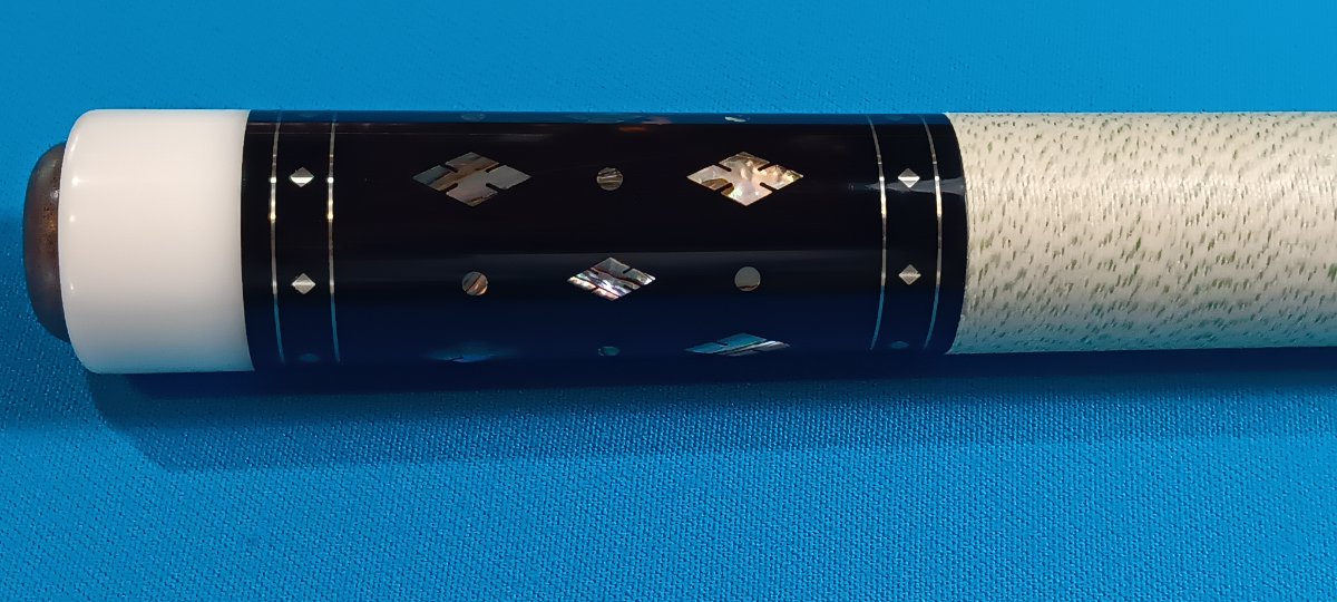 Available now is a beautiful Tascarella Cue. It comes out of a private collection and has not been played, just a few test hits with one shaft. The second shaft is brand new. The cue is in pristine condition, as if it came out of the shop yesterday. It is a four point cue with ebony and maple veneers. The forearm is birds eye maple and the butt sleeve is figured ebony. Each point has a slotted abalone diamond and 3 abalone dots. There are three Buska nickel silver rings above and below the wrap and one above the delrin butt cap. Each pair of nickel silver rings has 7 nickel silver diamonds in them. The cue is 58” split evenly with a 5/16x 14 stainless steel joint. There are 12 classic abalone split diamonds along with 12 abalone dots in the butt sleeve. The wrap is white Irish linen with green spec. The butt weighs 16.6 oz. The shafts are 13 mm and 13.2 mm and are 4.1oz and 4.4oz. The shafts have 1” IV ferrules with water buffalo hard tips. This cue is one of thirteen cues pictured in Billiard magazine for an article they did on the Tascarella shop. It is the fourth from the left. $9,500.00 O/B/O.