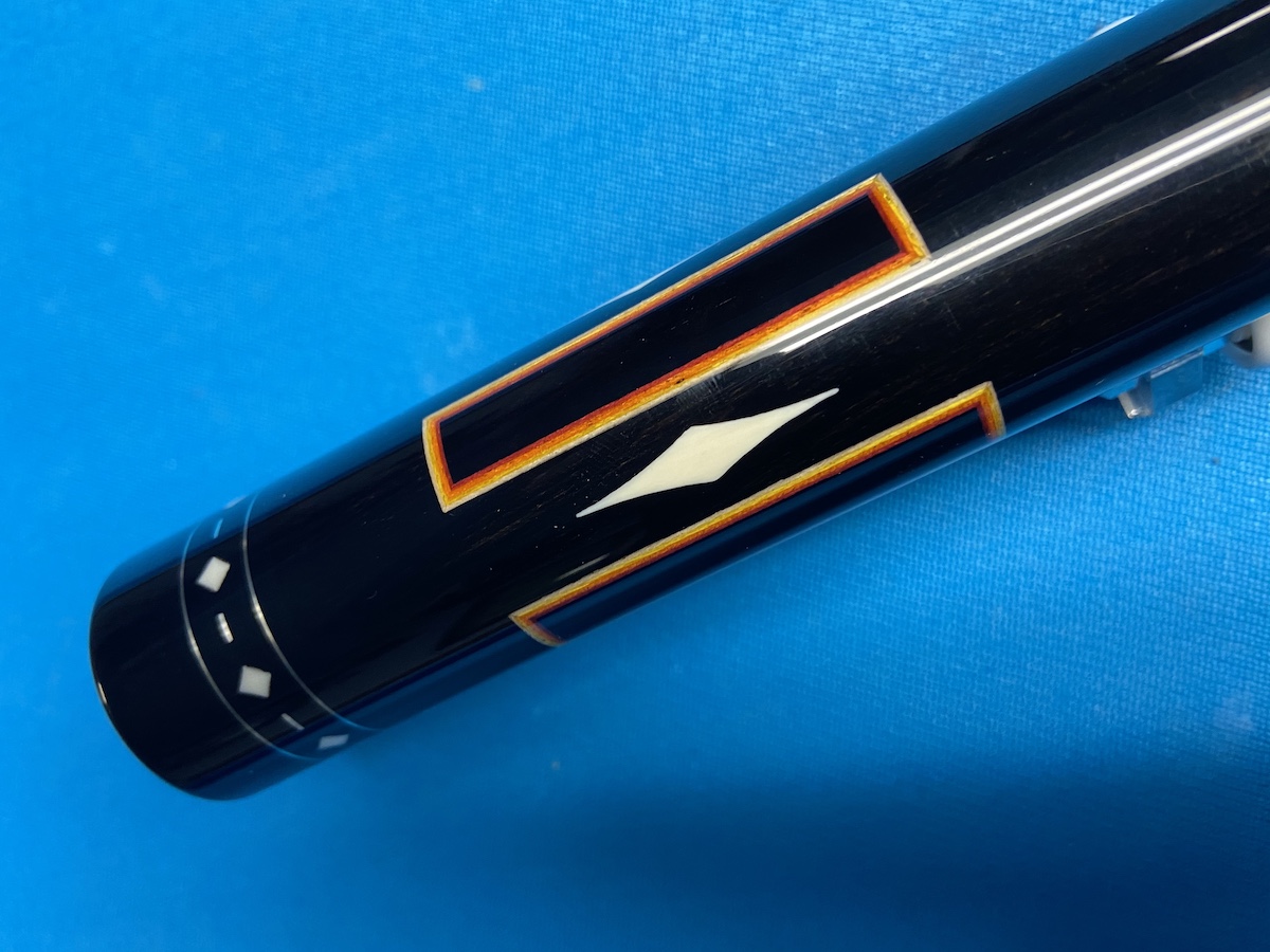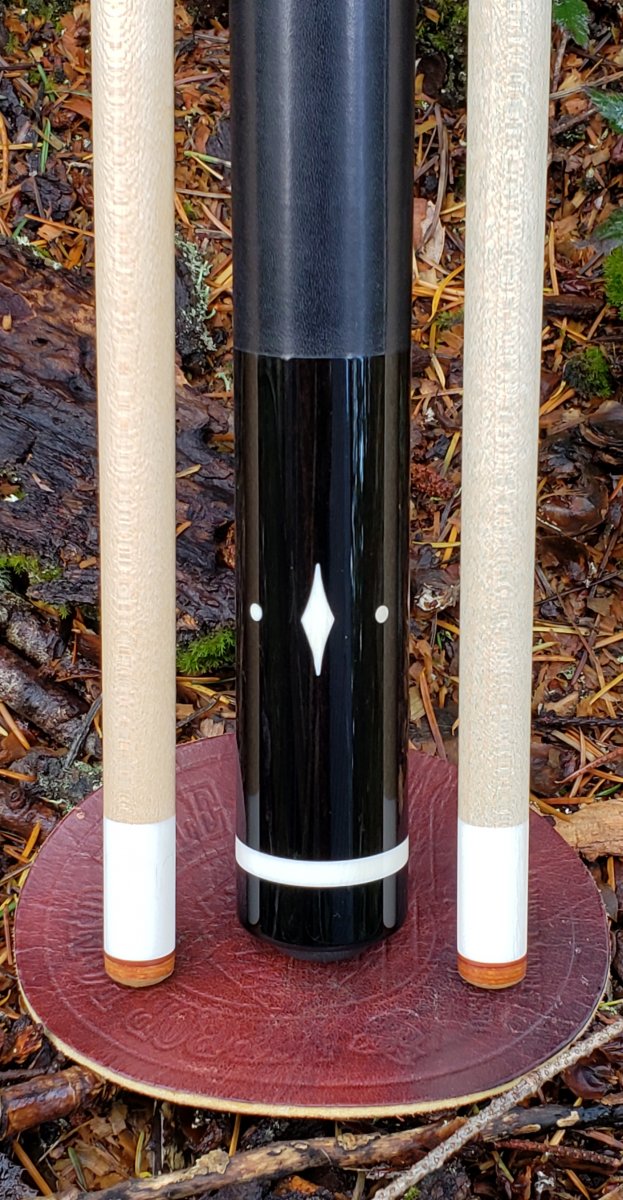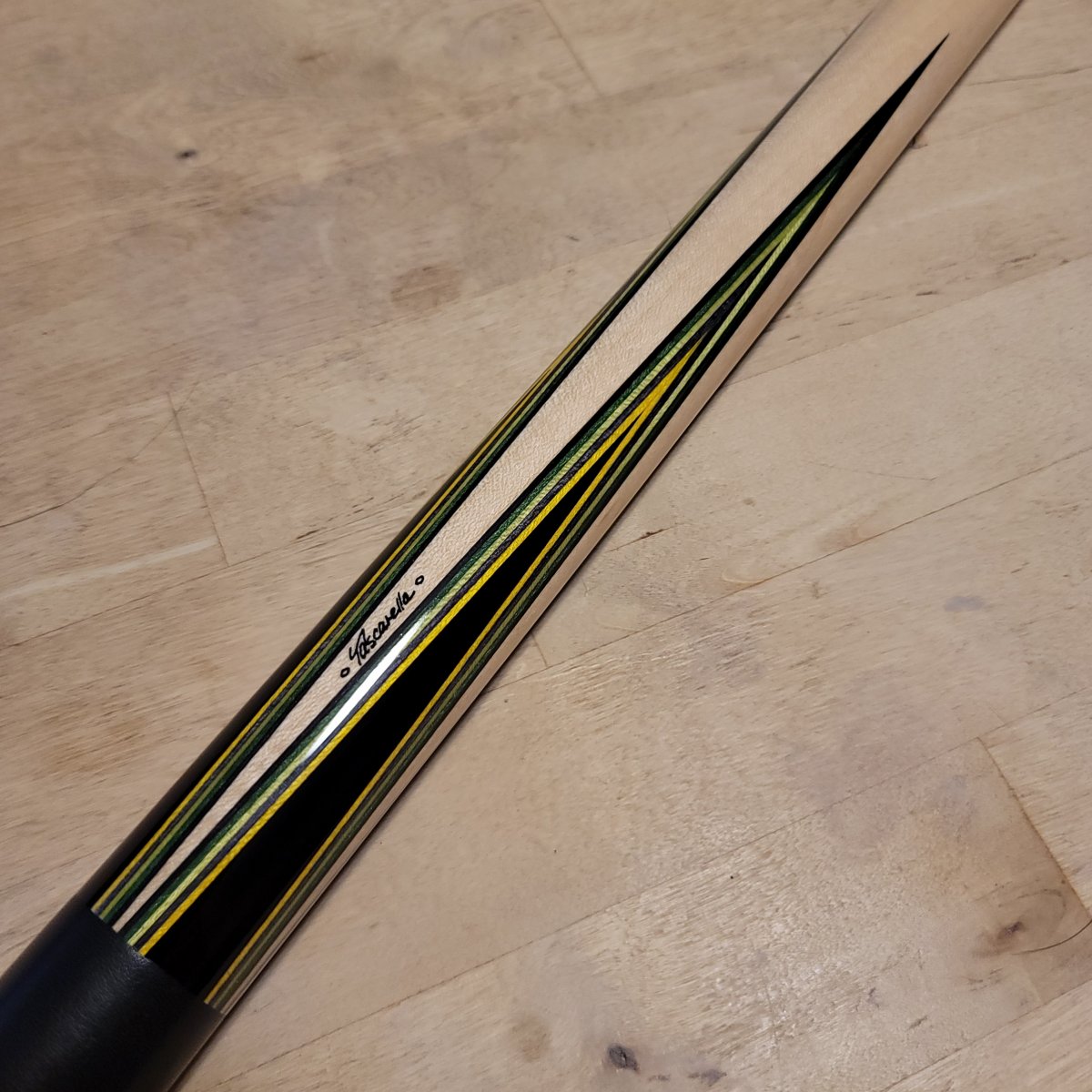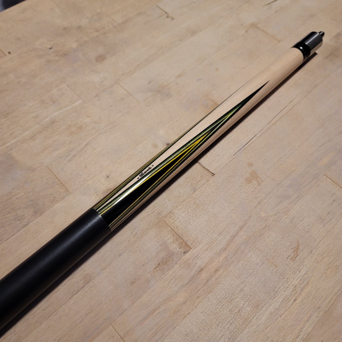 New unchalked with 3 shafts. been in his colllection for a few years. 4 point ebony into straight grain maple. Yellow, grey, light green, dark green, black veneers. Smooth leather wrap.