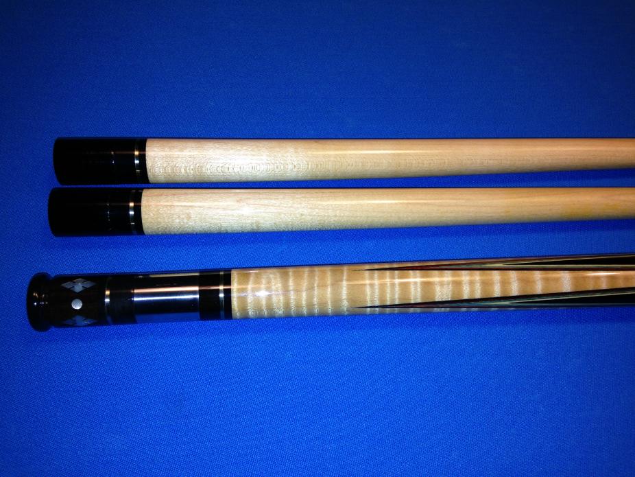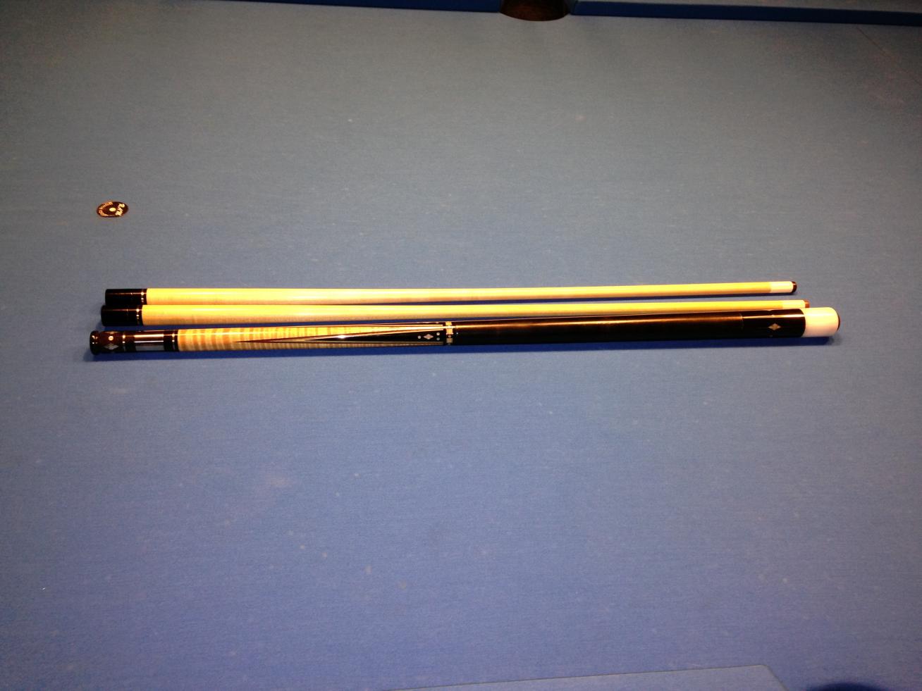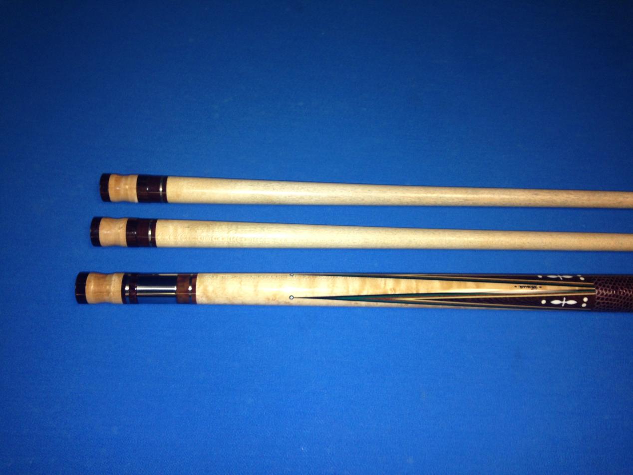 Older rosewood full splice with Acrylite big pin joint, butt cap & ferrule on Tasc shaft. Other shaft is a Predator with matching joint ring from Pete. I believe Marcus said he had this one before too.